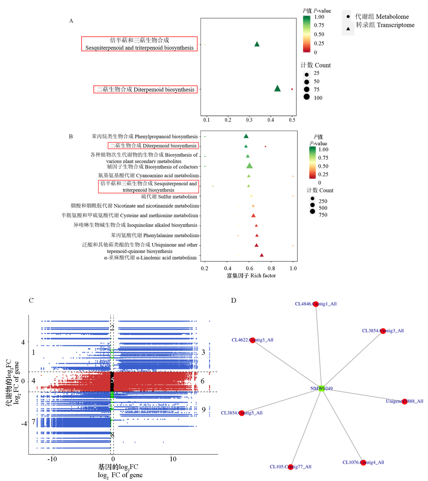 图7 两种组学联合分析的KEGG共同富集图 A:HZZ-S2 vs. MN-S2;B:HZZ-S4 vs. MN-S4;C:九象限(1 ~ 9)图(HZZ-S4 vs. MN-S4,象限3,7:基因与代谢物差异表达模式一致;1,9:基因与代谢物差异表达模式相反;象限5:基因与代谢物均非差异表达);D:ko00904(二萜类化合物的生物合成途径)网络图(HZZ-S4 vs. MN-S4),绘制的各差异组合网络图均为在香气样品中下调表达的基因和代谢物