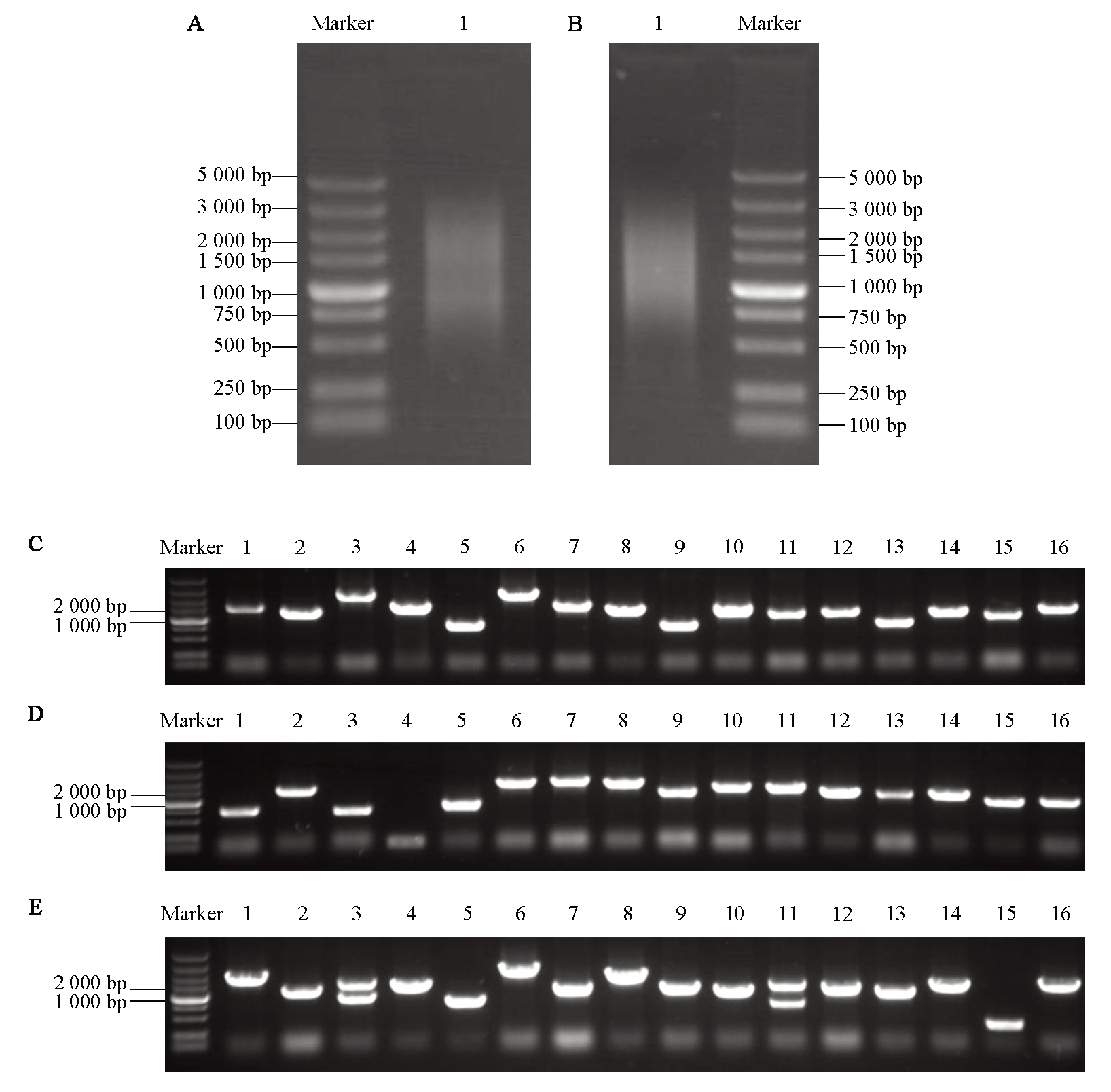 图1 芜菁酵母cDNA文库的构建及鉴定 A:cDNA合成电泳检测;B:cDNA均一化处理电泳检测;C:初级文库插入片段鉴定;D:次级文库插入片段鉴定;E:酵母文库插入片段鉴定。1 ~ 16:不同克隆的菌落PCR检测结果