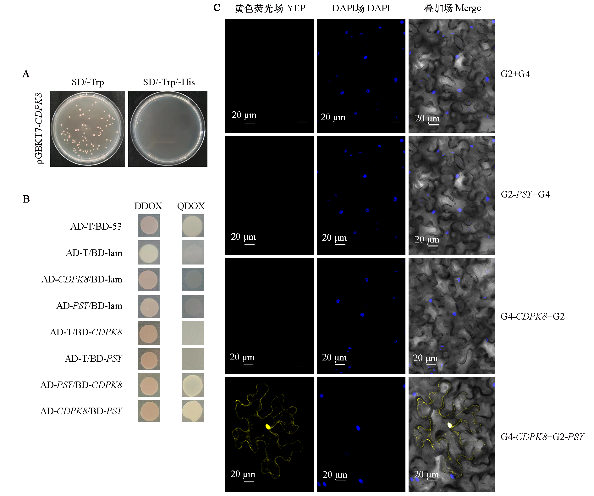 Fig. 4 Verification of interaction relationship between PSY and CDPK protein in turnips A:pGBKT7-CDPK Y2H Gold strain self-activation detection;B:Verification of interaction relationship between PSY and CDPK protein by yeast two-hybrid;C:Interaction between PSY and CDPK in BiFC experiment