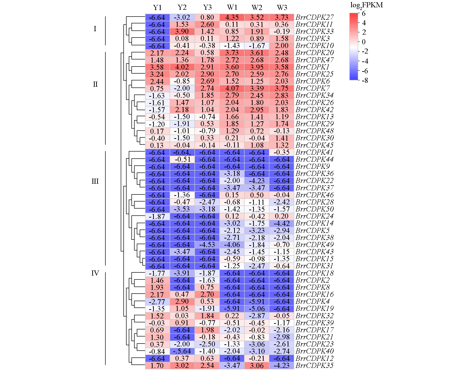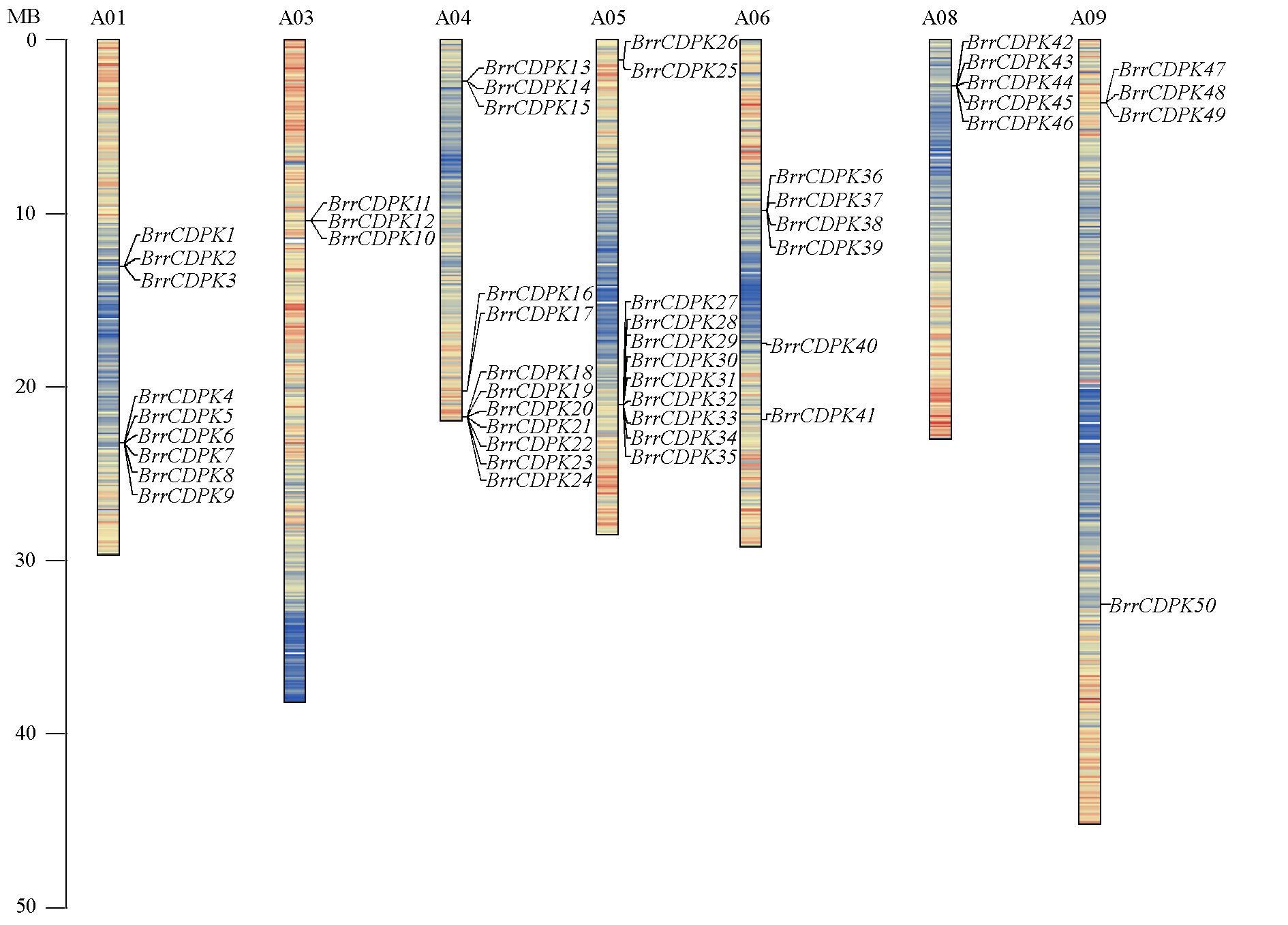以黄色芜菁W25和白色芜菁W21的不同组织为材料,构建芜菁cDNA酵母文库,库容1.5 × 107 CFU,插入片段平均长度 > 1 000 bp。通过构建的诱饵载体pGBKT7-PSY与构建的cDNA文库杂交,共获得了18个阳性互作蛋白,通过酵母双杂交及双分子荧光互补(BiFC)验证,明确了候选蛋白CDPK8与PSY存在互作关系。对CDPK家族进行鉴定,共鉴定出50个含有STKc_CAMK protein kinase和2个EF-hand结构域的CDPK基因(命名为BrrCDPK1 ~ BrrCDPK50),结构分析显示CDPK编码氨基酸数在411 ~ 660个之间,平均等电点为8.79,各CDPK蛋白之间保守基序数和结构差异不明显,均含有motif 1、motif 2、motif 3和motif 6,染色体定位显示BrrCDPKs在7条染色体上的分布是非随机的;系统发育分析表明芜菁BrrCDPK与拟南芥AtCDPK被聚为不同类,暗示其在进化过程中的基因复制具有一定的种属特异性,基因表达谱分析鉴定出14个在黄色芜菁中高表达的CDPK基因。