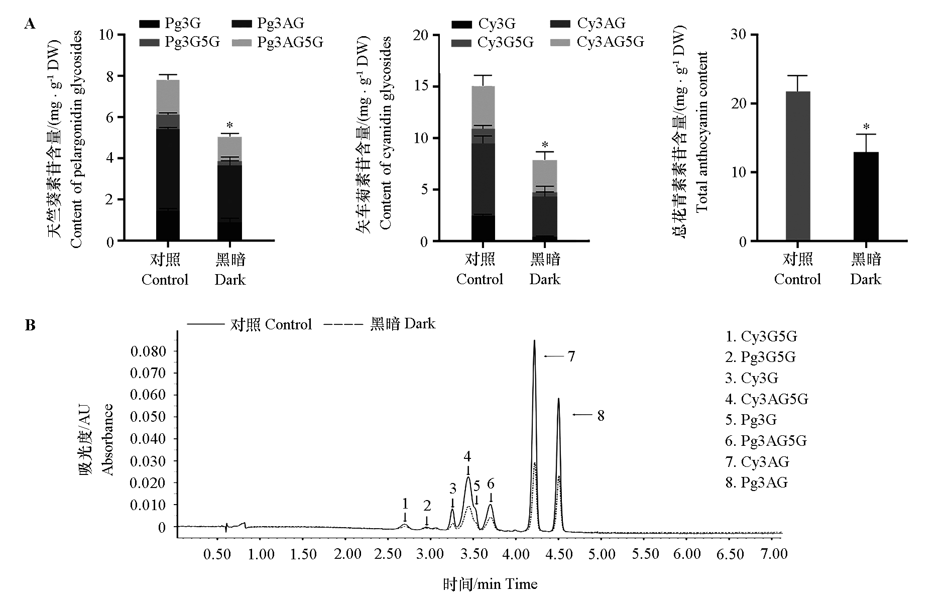 Fig. 3 Pigment content(A)and UPLC chromatogram(B)of Zinnia elegans from dark treatment and the control treatment Cy3G:Cyanidin-3-O-glucoside;Cy3G5G:Cyanidin-3,5-diglucoside chloride;Pg3G5G:Pelargonidin-3,5-diglucoside chloride;Cy3AG5G:Cyanidin-3-O-(6′′-acetyl)glucoside-5-O-glucoside;Pg3G:Pelargonidin-3-O-glucoside;Pg3AG5G:Pelargonidin-3-O-(6′′-acetyl)glucoside-5-O-glucoside;Cy3AG:Cyanidin-3-O-(6′′-acetyl)glucoside;Pg3AG:Pelargonidin-3-O-(6′′-acetyl)glucoside. t-Test,* P < 0.05