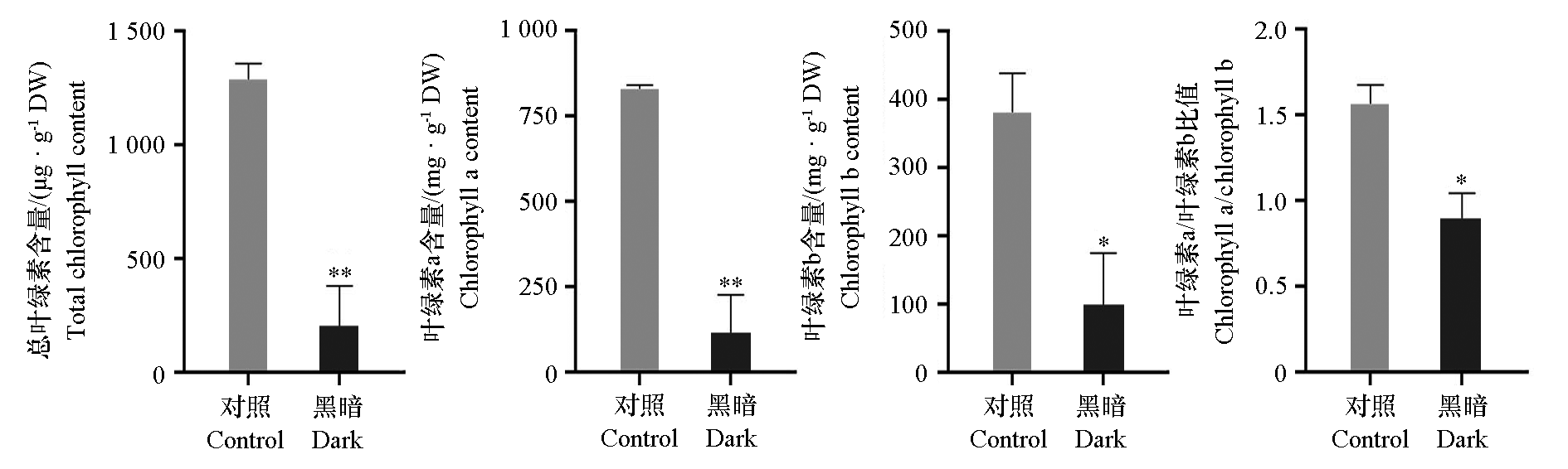 Fig. 4 Total chlorophyll content,chlorophyll a content,chlorophyll b content,chlorophyll a/b ratio of Zinnia elegans from dark treatment and the control treatment t-Test,* P < 0.05,** P < 0.01