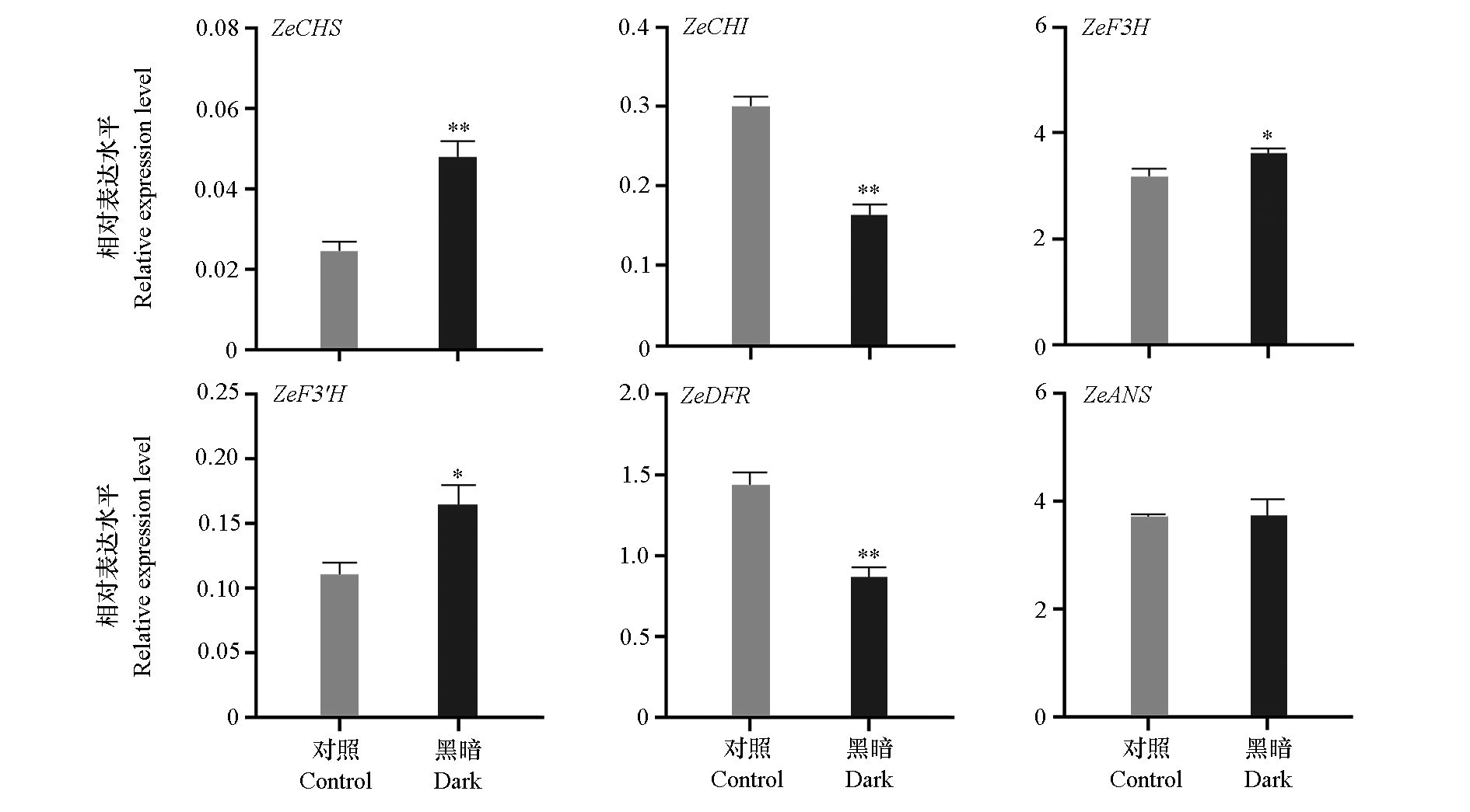 Fig. 5 Relative expression level of anthocyanin synthesis-related enzyme genes of Zinnia elegans t-Test,* P < 0.05,** P < 0.01