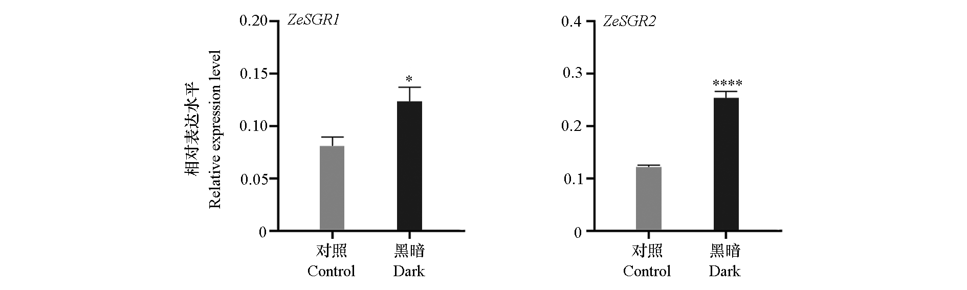 Fig. 7 Relative expression level of ZeSGR1 and ZeSGR2 of Zinnia elegans in dark treatment t-Test,* P < 0.05,**** P < 0.0001