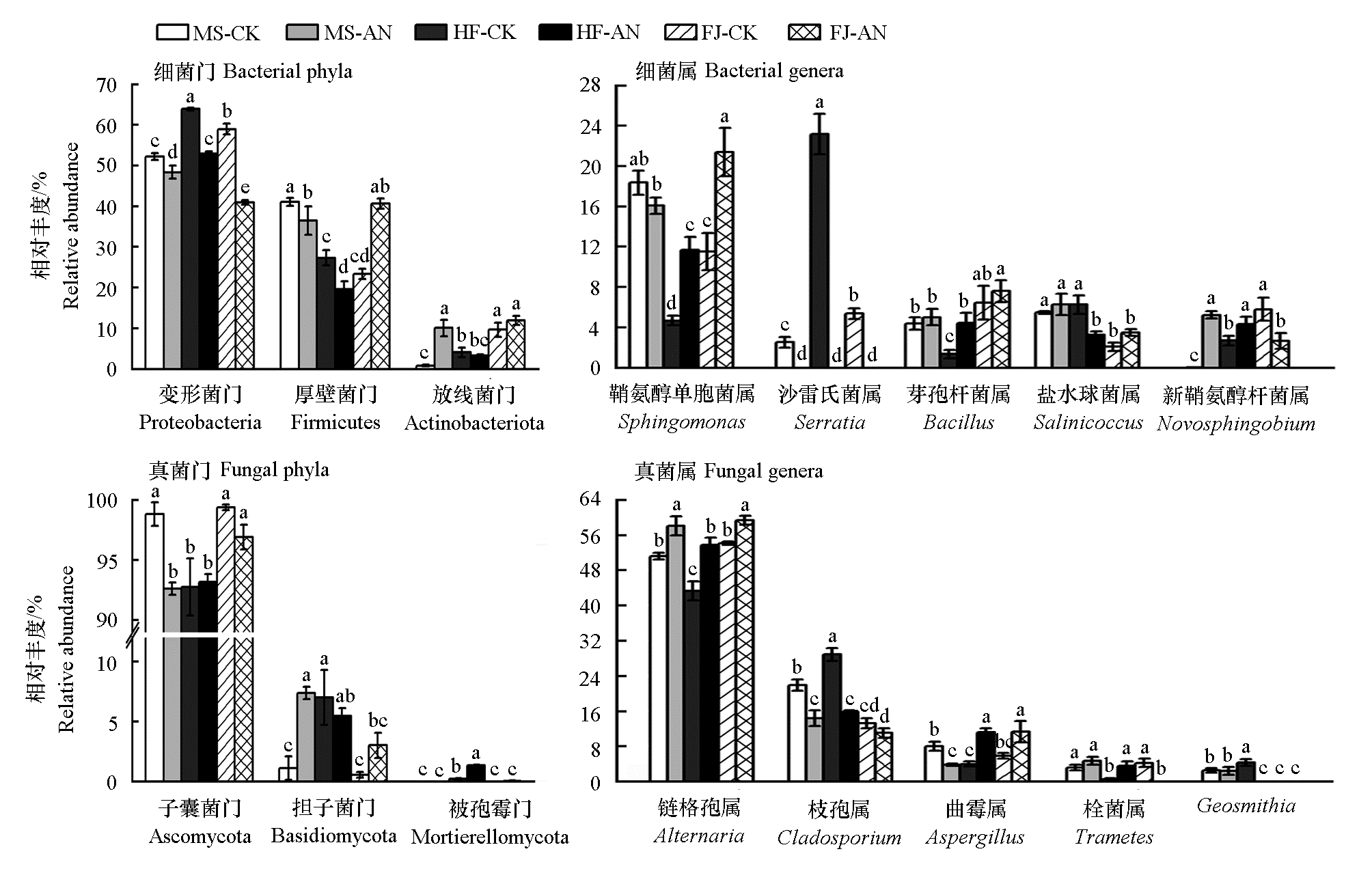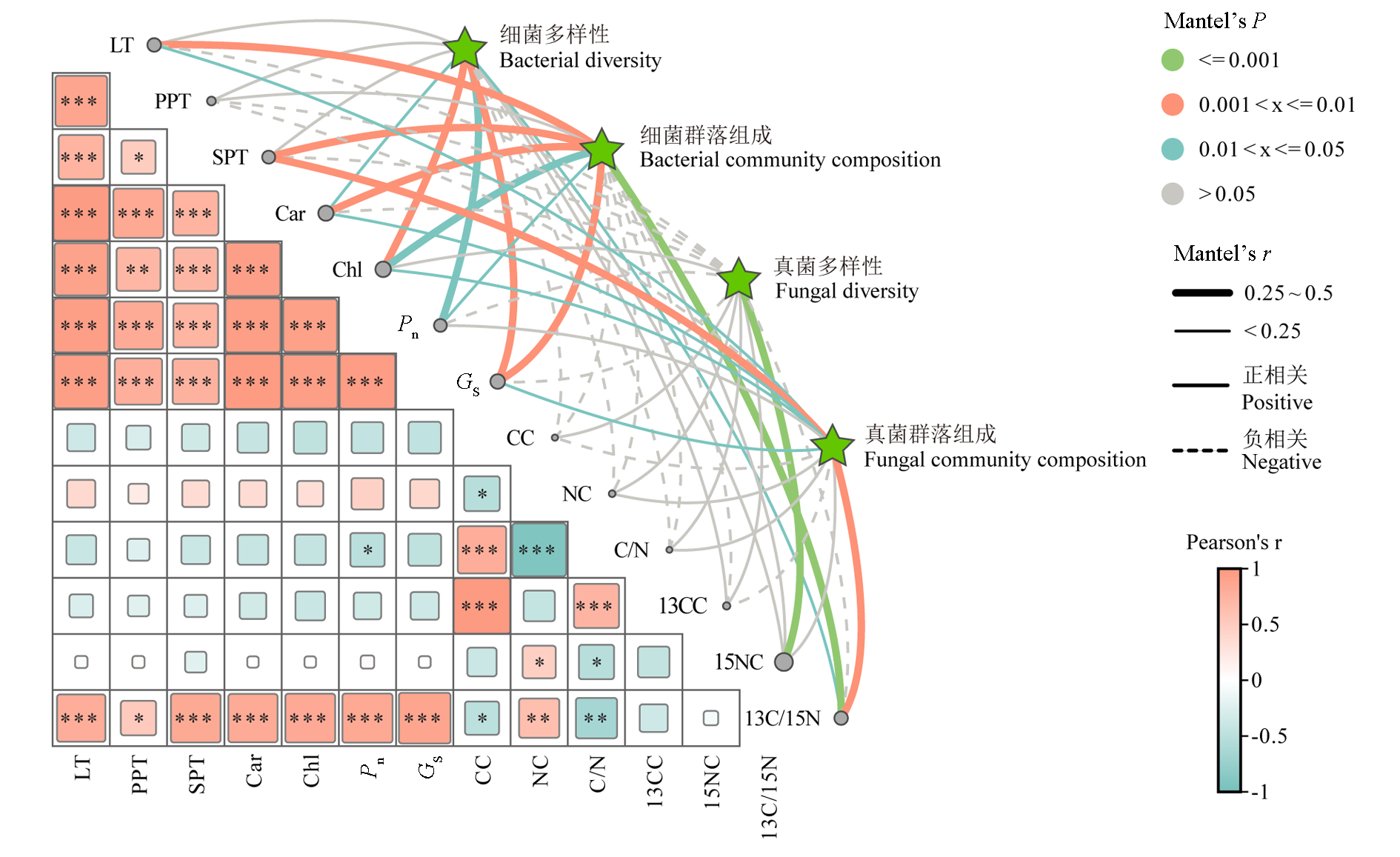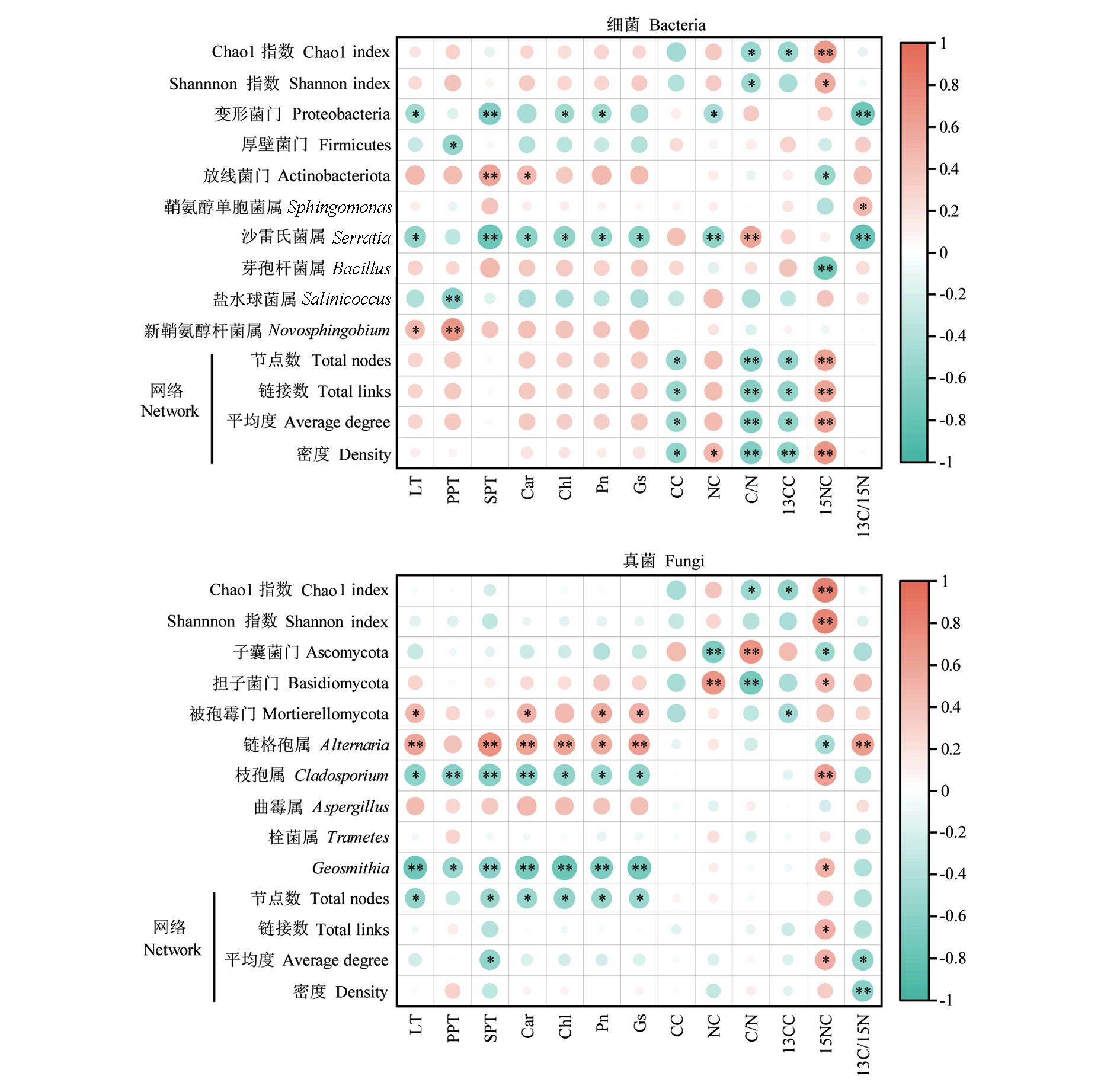 以新疆野苹果[Malus sieversii(Ledeb.)Roem.]为砧木,分别嫁接新疆野苹果、‘寒富’(Malus × domestica Borkh.‘Hanfu’)和‘富士’(M. × domestica Borkh.‘Fuji’),设不施氮与施氮(0.2 g · kg-1土)处理,采用稳定同位素示踪和高通量测序技术,测定接穗的叶片组织结构、光合特性、碳氮含量和内生菌群落结构的变化特征,探究氮素调控对苹果接穗叶片生理及内生微生物协同适应性的影响机制。结果表明,不施氮条件下‘富士’的叶片厚度、叶绿素含量和碳氮比均显著高于‘寒富’和新疆野苹果;施氮后‘寒富’的叶片净光合速率和气孔导度分别显著提高24.84%和73.86%,且其光合效率显著优于其他两种接穗。叶片内生菌群落分析表明,‘寒富’表现出最高的细菌和真菌群落多样性和丰富度,施氮处理进一步提升了其内生细菌群落的多样性指数(Chao1和Shannon指数分别增加7.30%和61.96%)和网络复杂性(节点数为598,链接数为75 728)。此外,施氮处理显著促进了‘寒富’叶片中功能有益菌属的富集,其中芽孢杆菌属(Bacillus)、新鞘氨醇单胞菌属(Novosphingobium)和鞘氨醇单胞菌属(Sphingomonas)的相对丰度分别较不施氮处理显著提高了226.21%、59.35%和149.42%。综上,氮素施用可显著改善苹果接穗叶片的光合特性并优化内生菌群落结构,其中‘寒富’接穗在氮素充足条件下表现出更优的光合性能和更稳定的内生菌群落。