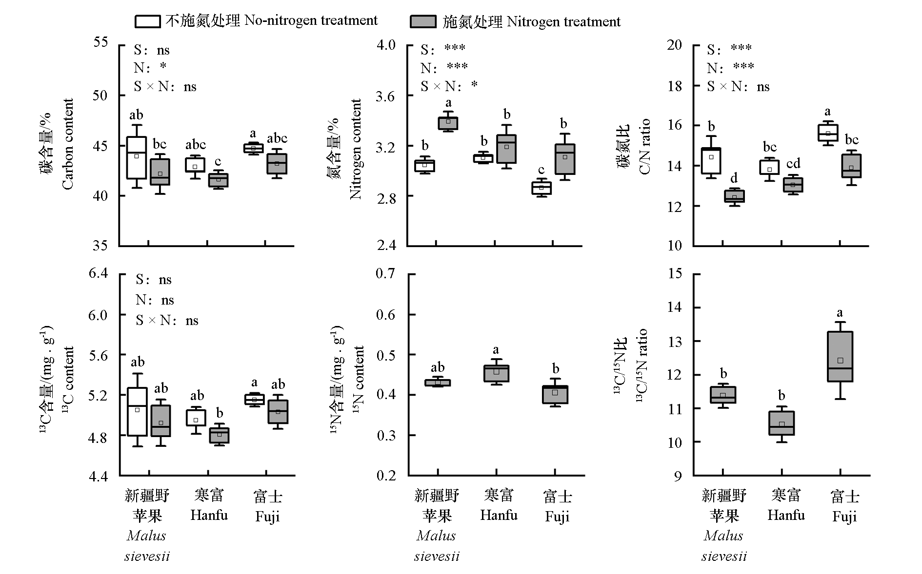 关键词: 苹果, 新疆野苹果, 接穗, 施氮, 光合特性, 稳定同位素, 内生菌