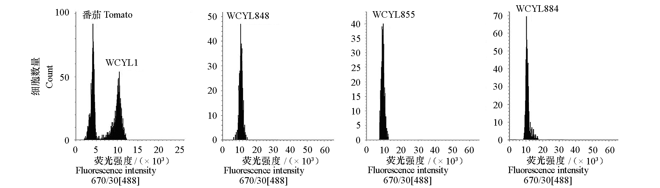 Fig. 1 Estimation of genome size of tomato(internal control)and Magnolia biondii samples WCYL1,WCYL848,WCYL855 and WCYL884 by using flow cytometry