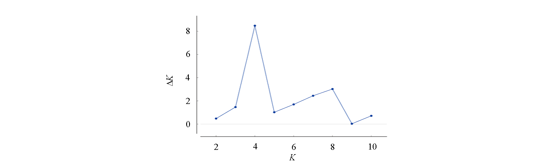 表3 917份望春玉兰种质材料各亚群的最大Q值分布