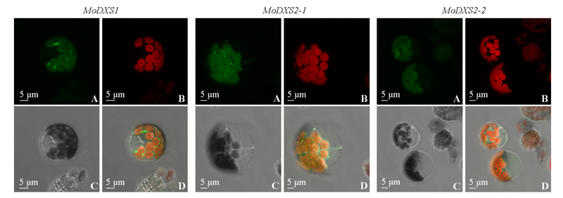 Fig. 4 Subcellular localization of MoDXS-eGFP A:Fluorescence microscope images of MoDXS-eGFP at 488 nm;B:Chlorophyll autofluorescence at 555 nm;C:Bright field;D:Merged image.