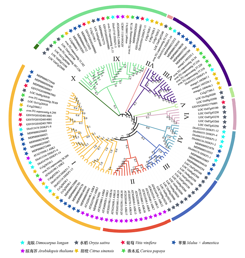 Fig. 2 Phylogenetic tree of the SKP1-like family members:longan,Arabidopsis,sweet orange,papaya,rice,grape,and apple The numbers are bootstrap values based on 1 000 iterations.