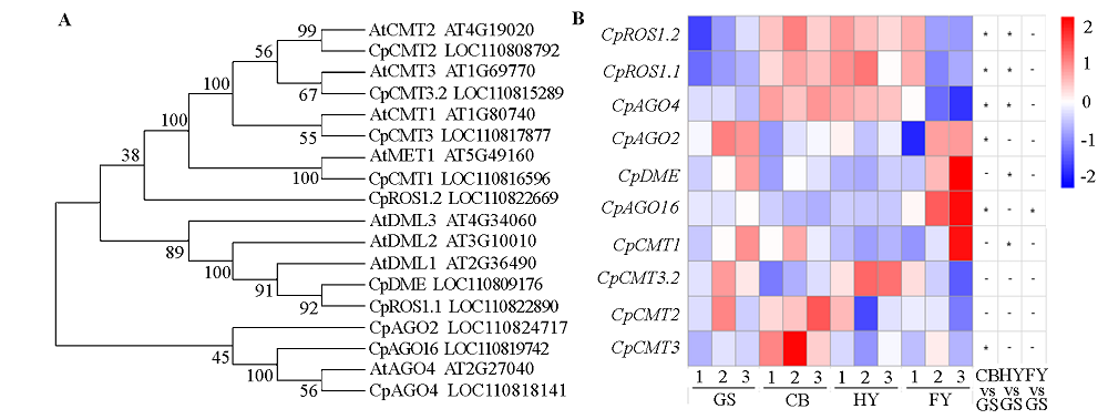 Fig. 7 Homologous alignment of DNA methylation genes(A)and their expression changes at different ripening stages in papaya fruits(B) Scale:From blue to red represent the gene expression levels was from low to high. 1-3:Three biological replicates.*:P < 0.05;-:No significant difference.