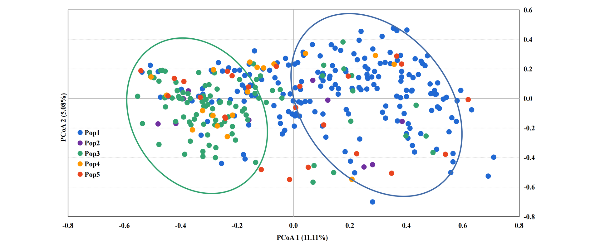 Fig. 5 Principal coordinate analysis of five Chinese chestnut cultivars groups Pop1 is the north China group;Pop2 is the northwest China group;Pop3 is the middle and lower reaches of the Yangtze River group;Pop4 is the southeast China group;Pop5 is the southwest China group.