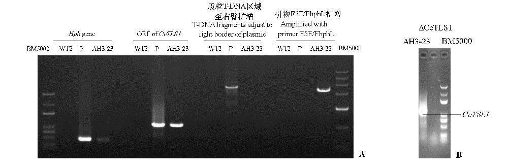 Fig. 2 PCR of low virulent Corynespora cassiicola HG15052104 CcTLS1 heterologous expression strains(A)and qRT-PCRof CcTLS1 expression(B) WT2:HG15052104 Wild-type:P:Heterologous expression vector plasmid;AH3-23:Heterologous expression strain;ΔCcTLS1:Knockout strain. The same below.
