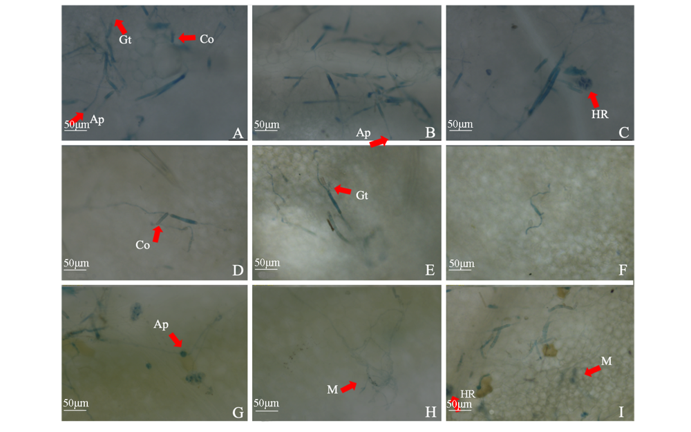 Fig. 5 Observation on micromorphology of cucumber leaves infected by conidia of Corynespora cassiicola virulent strain HG14102524 A-C:Inoculation with HG14102524 wild-type for 12 h;D-F:Inoculation with knockout strain ΔCcTLS1 for 12 h;G,H:Inoculation with HG14102524 Wild-type for 24 h;I:Inoculation with knockout strain ΔCcTLS1 for 24 h;Co:Conidia;Gt:Germ tube;Ap:Similar to appressorium structure;M:Mycelium;HR:Hypersensitive response.