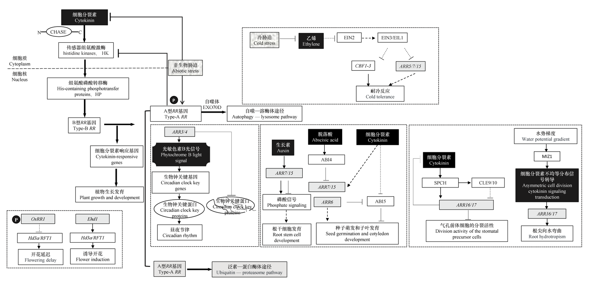 | 非生物胁迫敏感性 Sensitivity to abiotic stress | 拟南芥 A. thaliana | ARR5 | 细胞核 Nucleus | 过表达耐寒 The overexpressing plants increased freezing tolerance. | Dortay et al., |