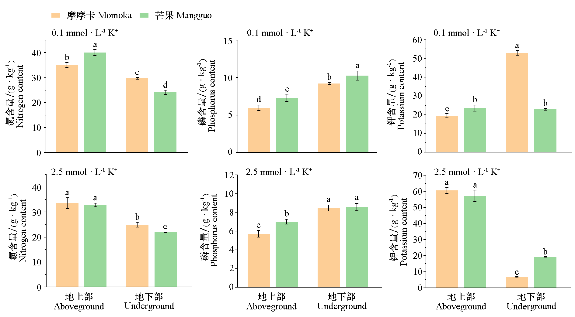 Fig. 2 Nitrogen,Phosphorus,potassium content of different potassium efficiency genotypes cultivars of cut chrysanthemum Different lowercase letters indicate statistically significant differences(P < 0.05)among cultivars and parts