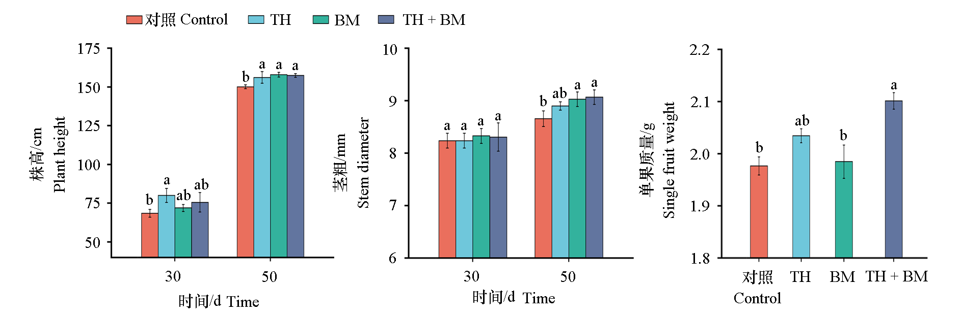 Fig. 2 The plant height,stem diameter and single fruit weight of melon under different treatments Difference lowercase letters indicate significant difference at the P < 0.05 level