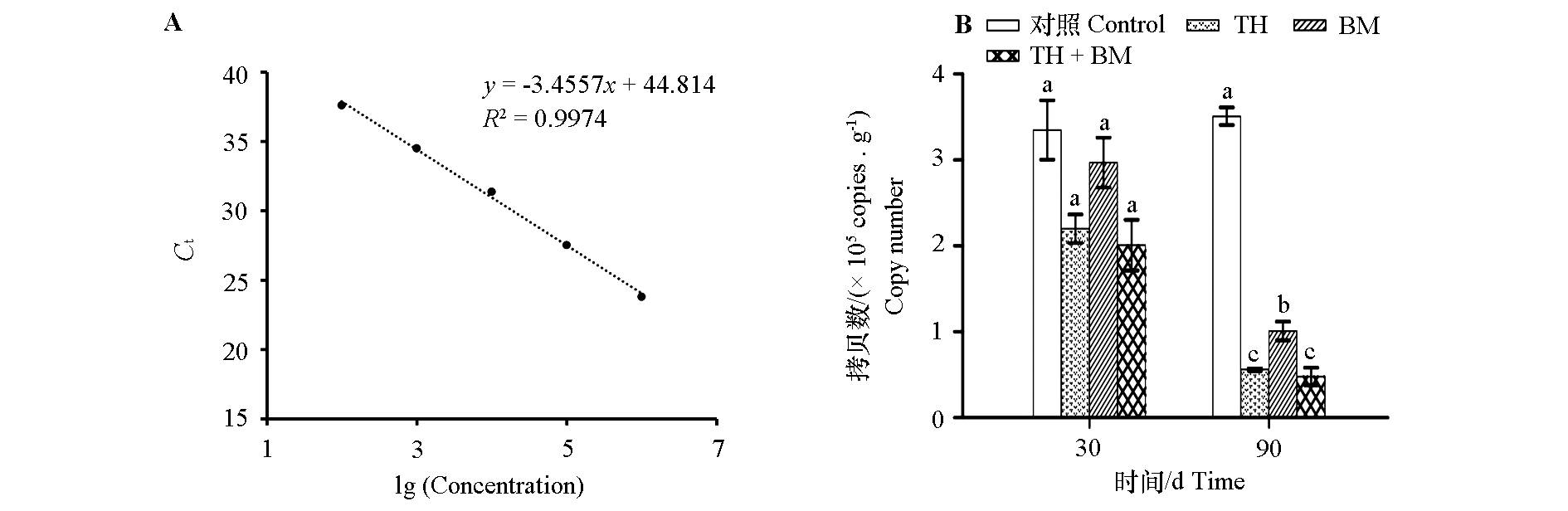 Fig. 5 qPCR analysis of Fusarium oxysporum in melon soil A:qPCR standard curve of F. oxysporum;B:The abundance of F. oxysporum in melon soil of different treatments
