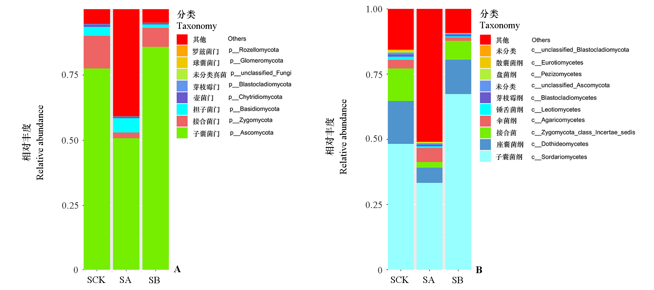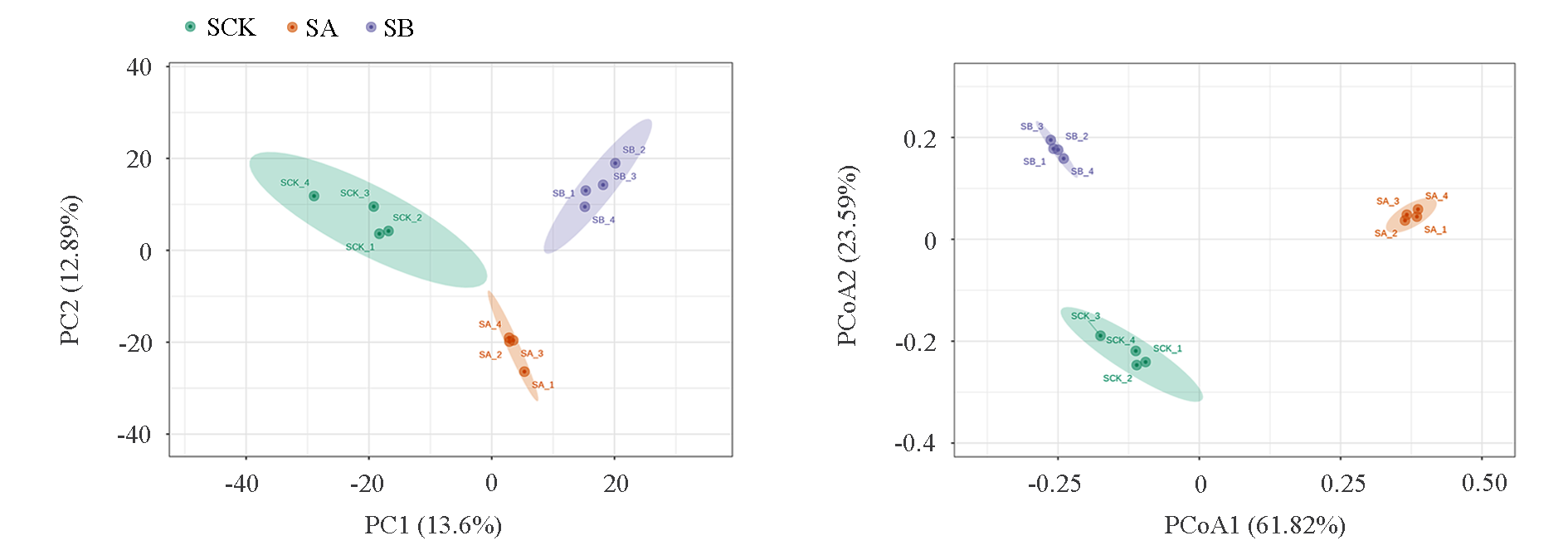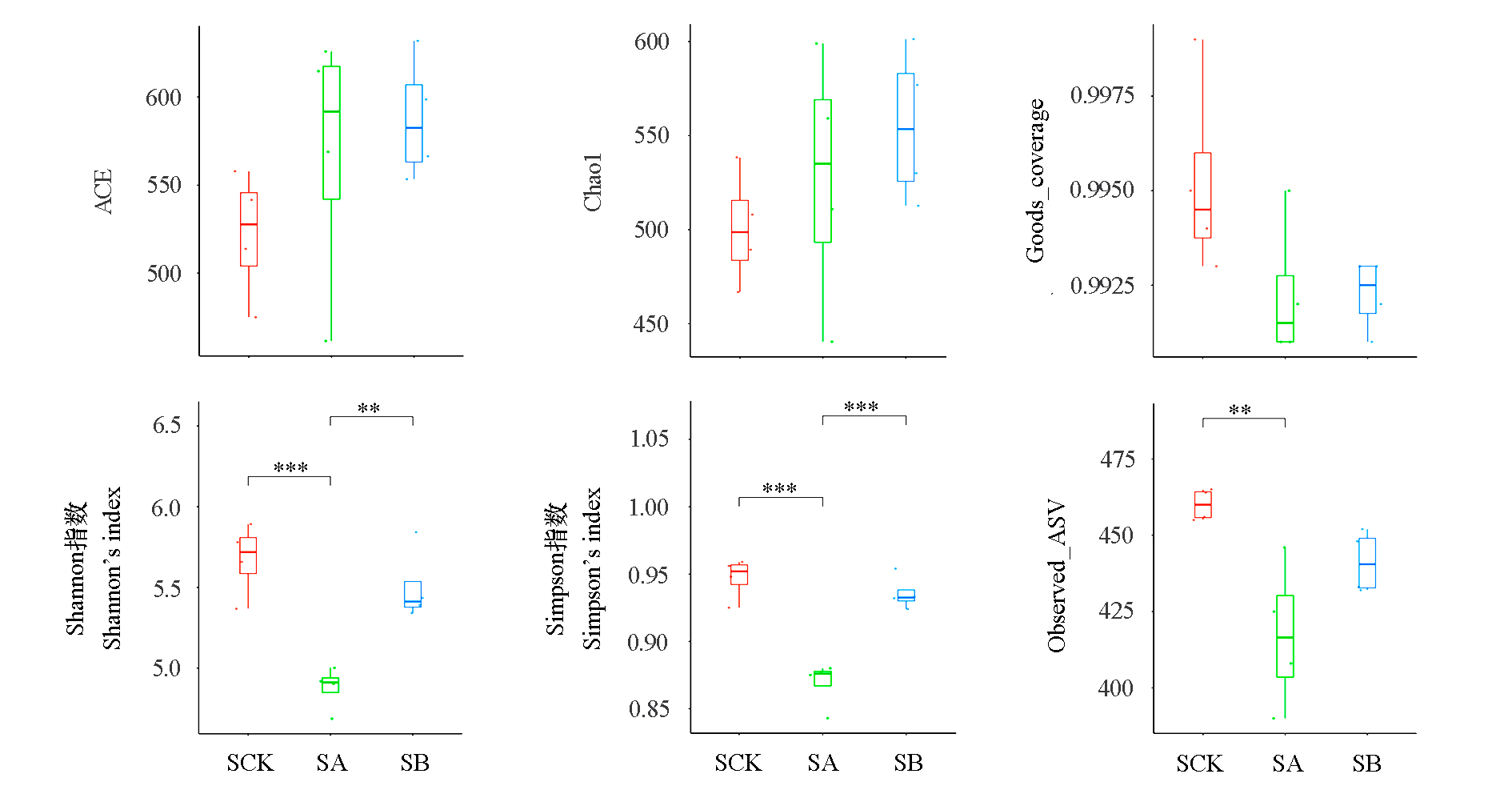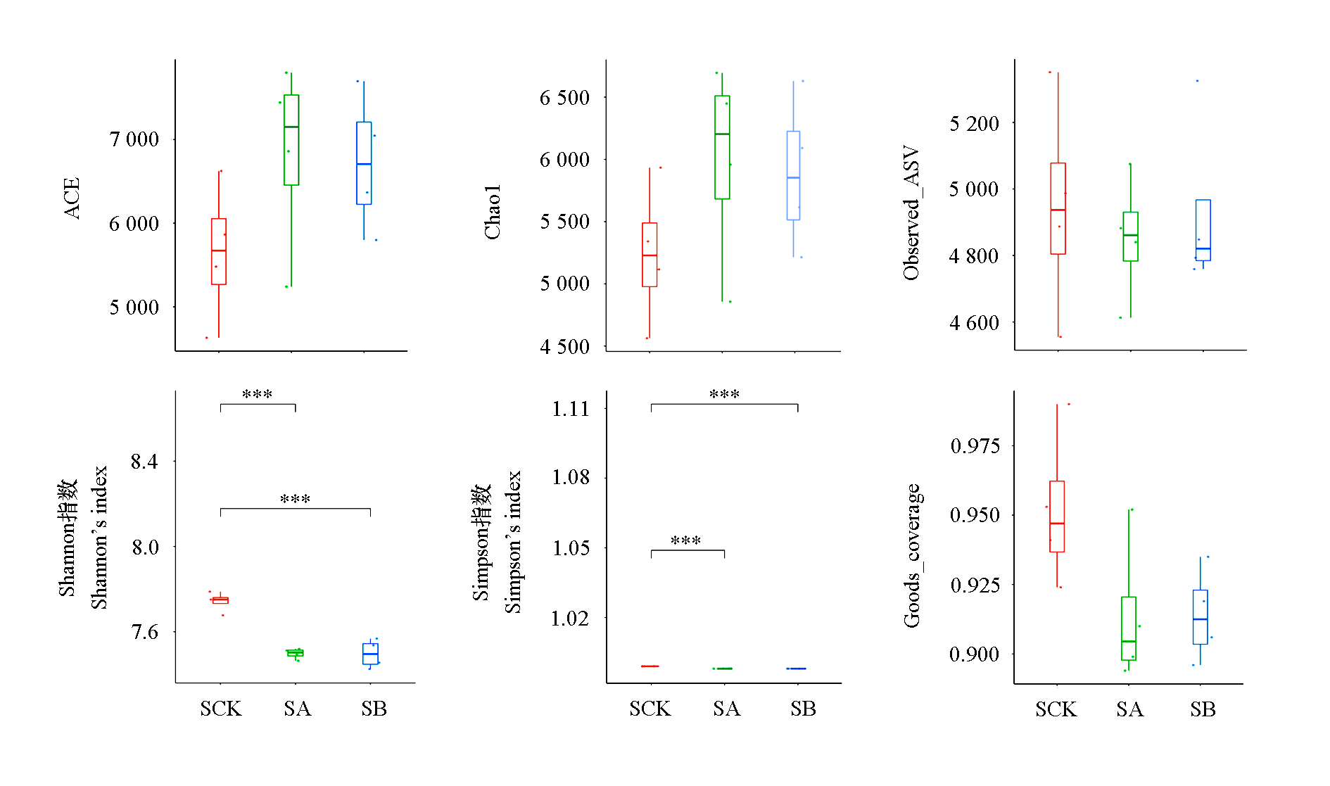 Fig. 1 α diversity of bacterial communities under different grasses cultivation patterns SA:Artificially planting a mixture of Vicia villosa,Trifolium repens and Taraxacum mongolicum;SB:Artificially planting Lolium perenne being the main method,plus planting a small amount of Trifolium repens,Vicia villosa and Taraxacum mongolicum;SCK:Control,semi-cultivation and semi-natural grass mode. The method of significant difference analysis is the Tukey test,*** P < 0.001. The same below