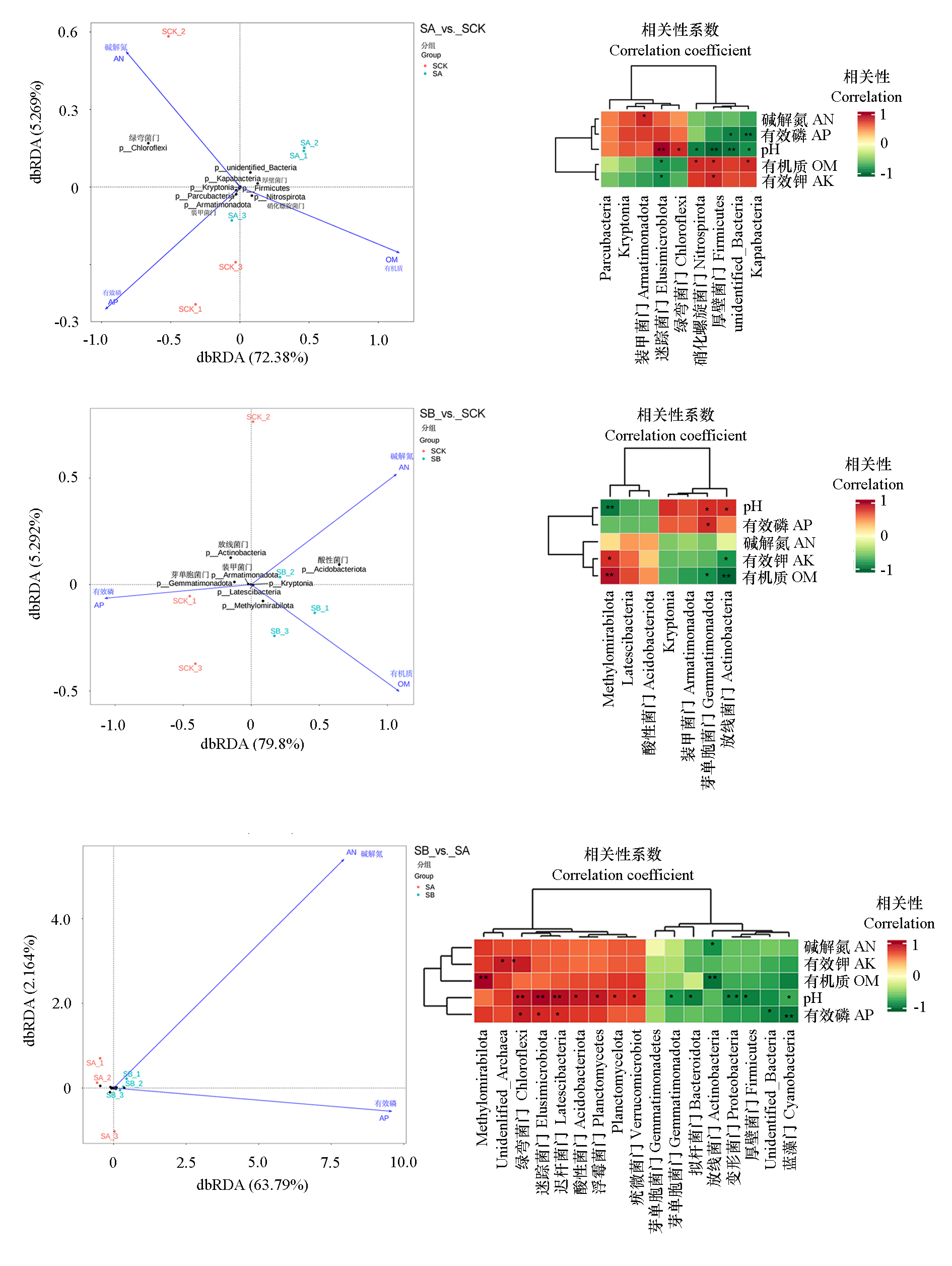 Fig. 10 Redundancy analysis of structure of soil bacterial community and soil environmental physicochemical factors under different grass modes at phylum level