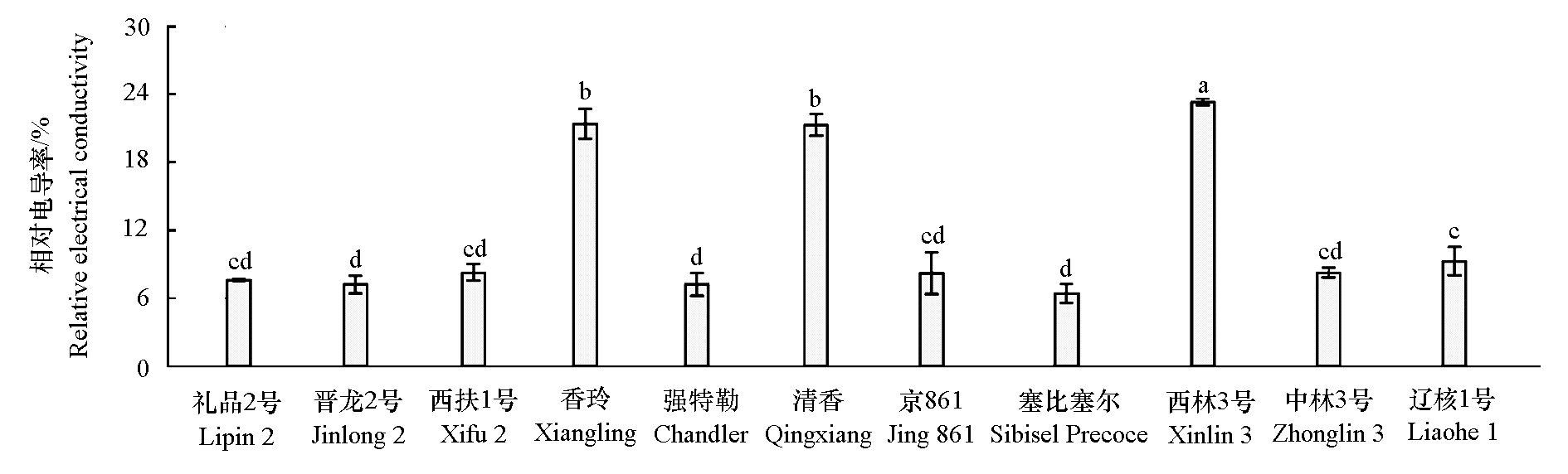 Fig. 1 Relative electrical conductivity of eleven walnut cultivars after low-temperature treatment Different lowercase letters indicate significant differences among different cultivars determined by Duncan’s multiple range test(P < 0.05). The same below