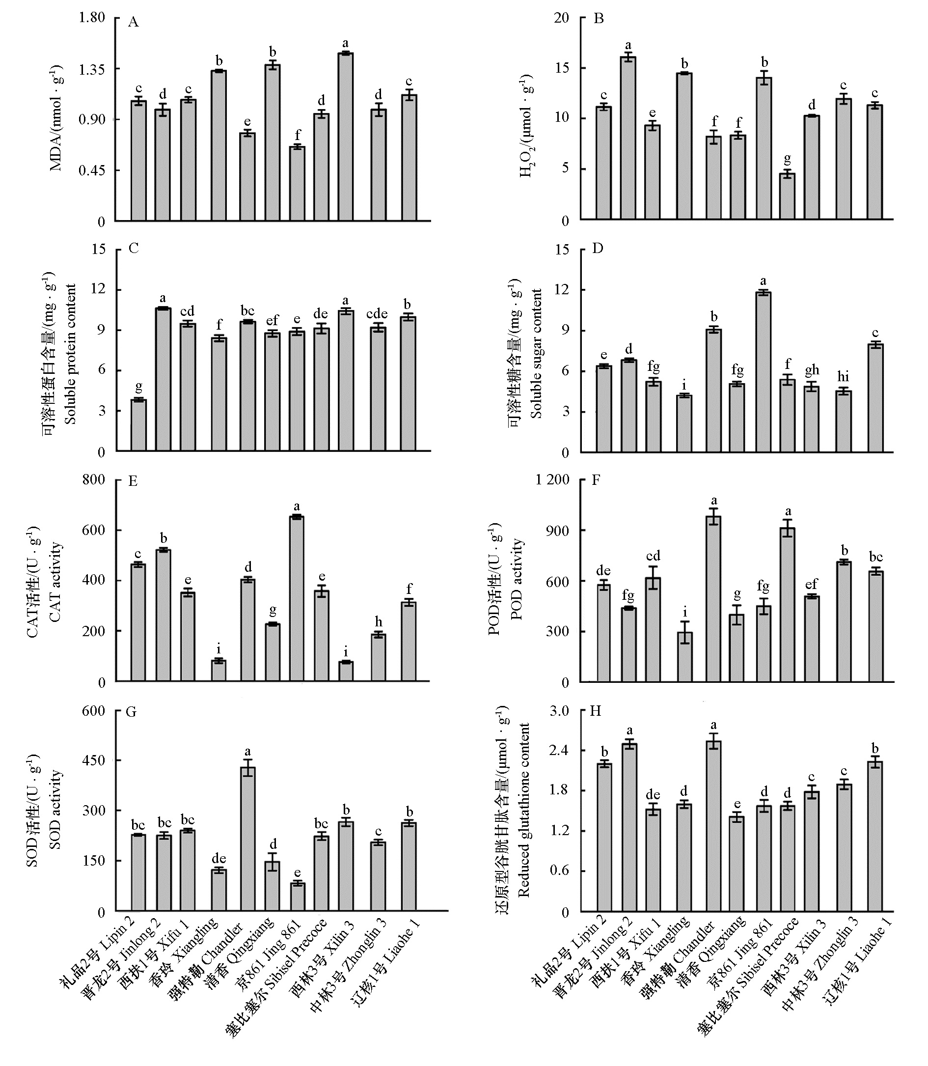 Fig. 2 Content of malondialdehyde,hydrogen peroxide,soluble proteins,soluble sugar,reduced glutathione content,and activities of catalase(CAT),peroxidase(POD),and superoxide dismutase(SOD)in different walnut cultivars after low-temperature treatment