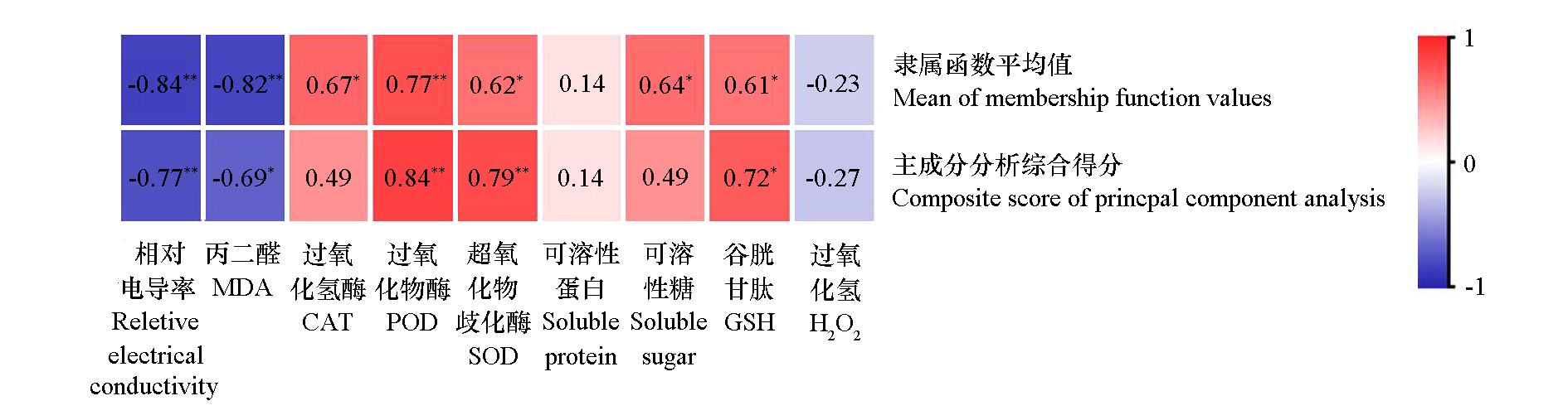 Fig. 4 Correlation heatmap between physiological indexes and cold tolerance Red represents positive correlation and blue represents negative correlation,* P < 0.05;** P < 0.01
