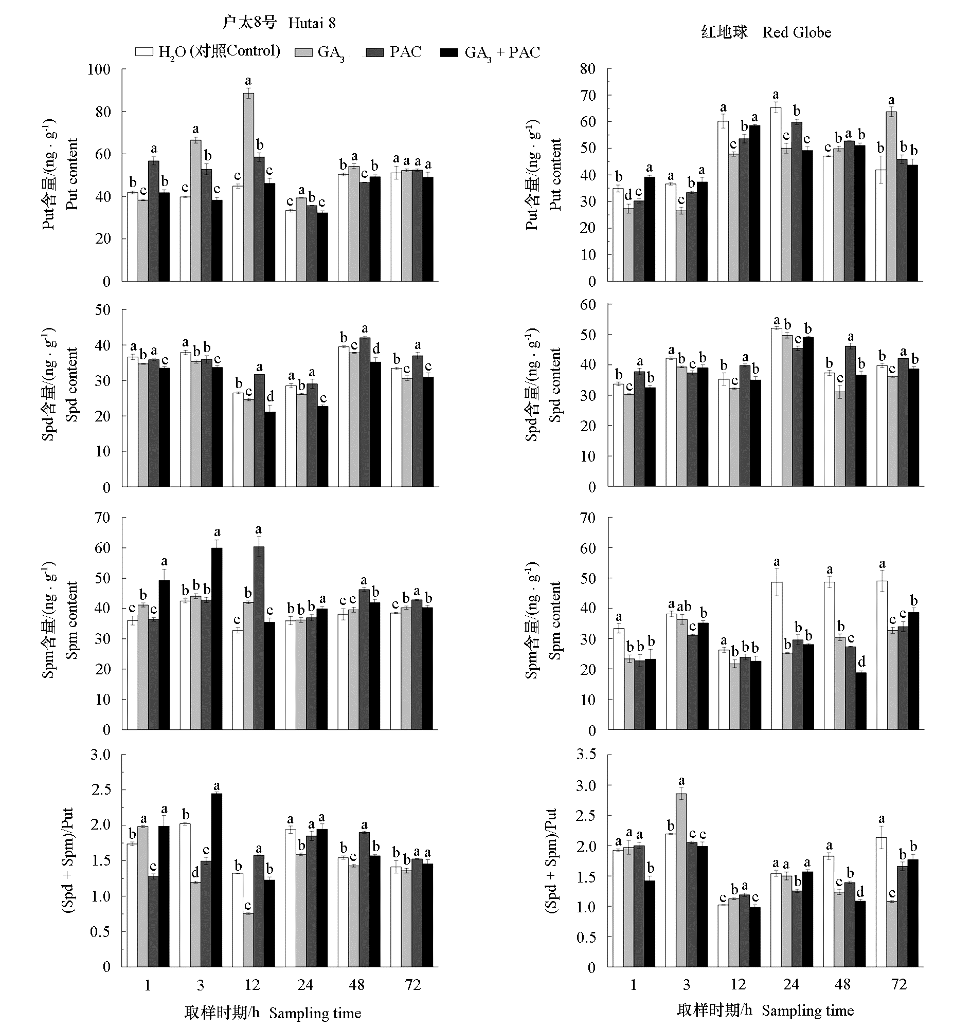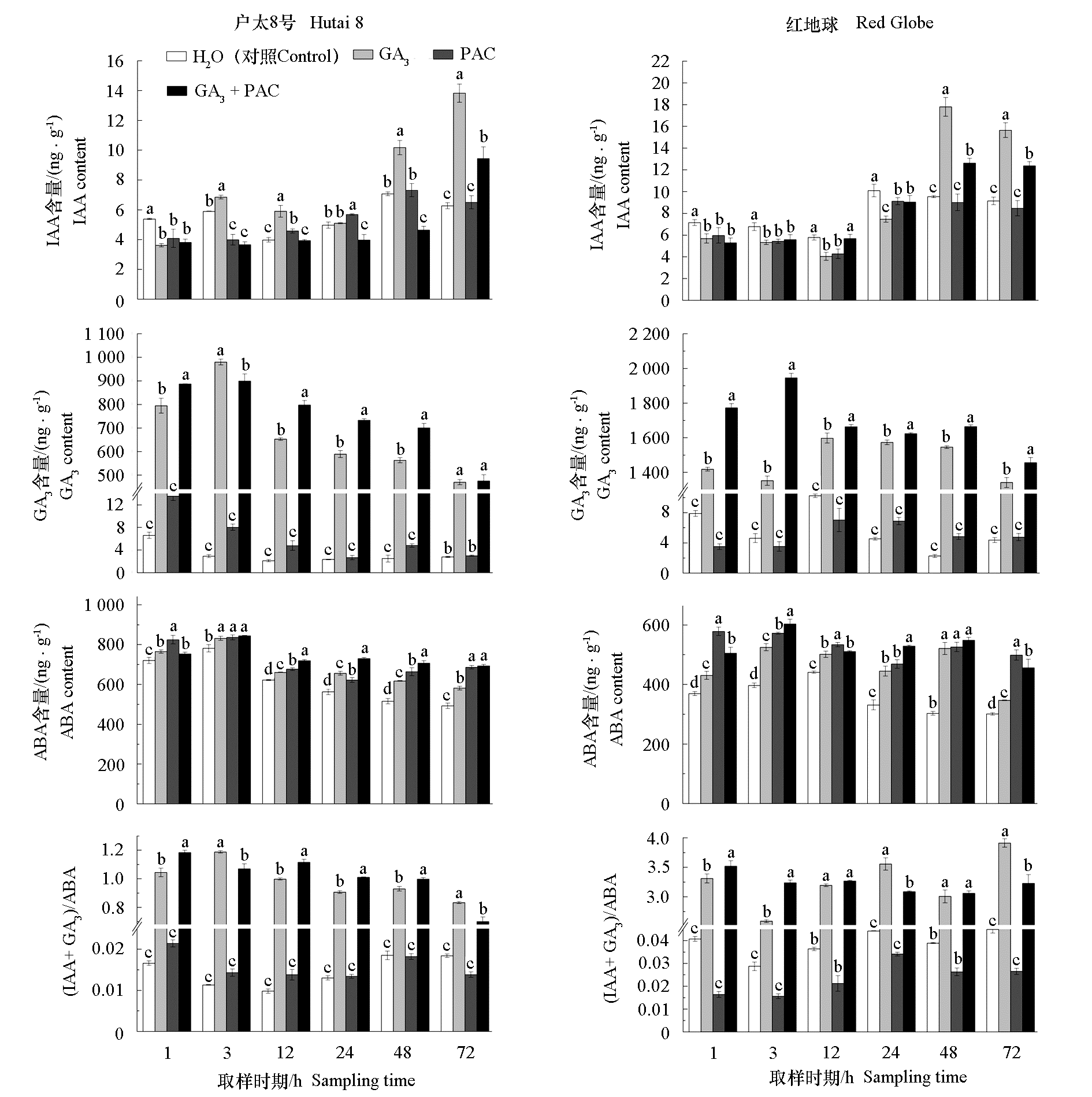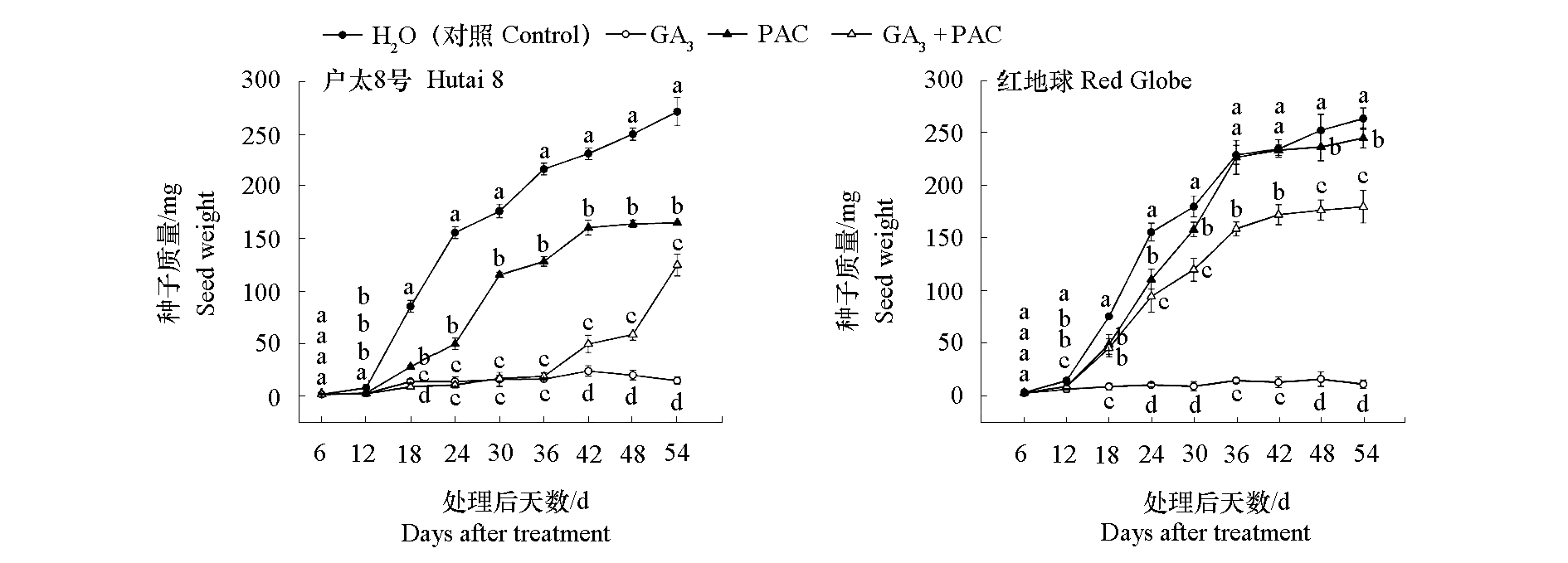 Fig. 1 Effects of GA3 treatment on seed quality of‘Hutai 8’and‘Red Globe’grapes Different lowercase letters indicate significant differences among treatments at the same time(P < 0.05). The same below