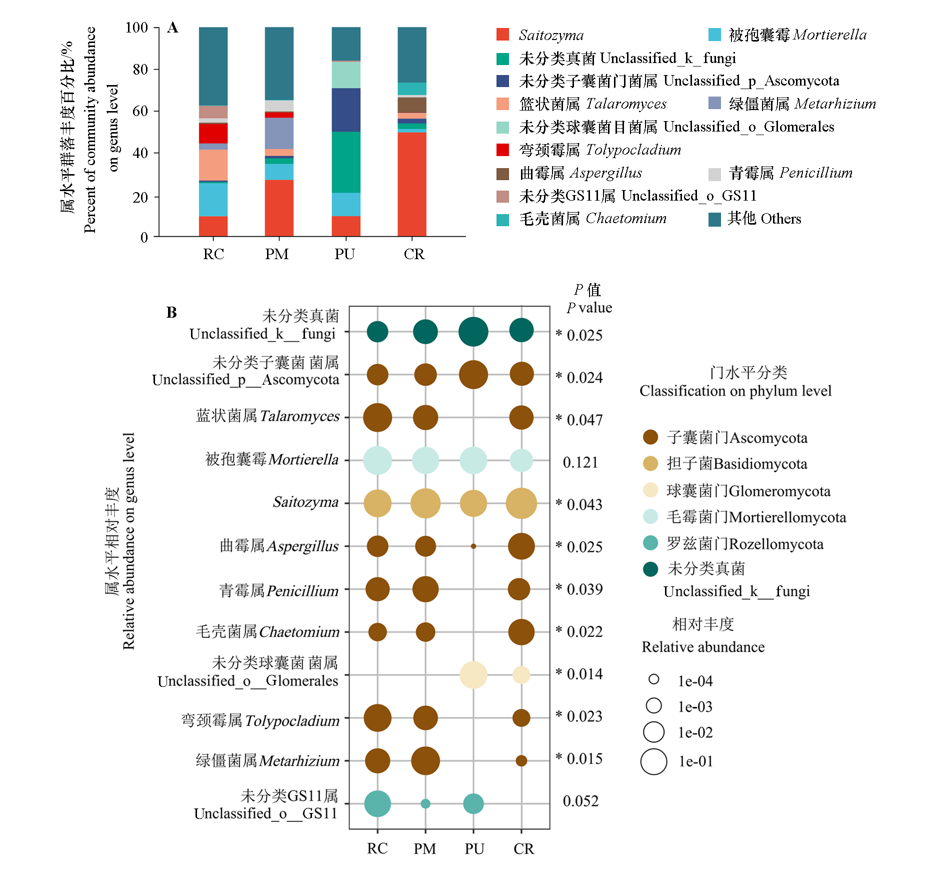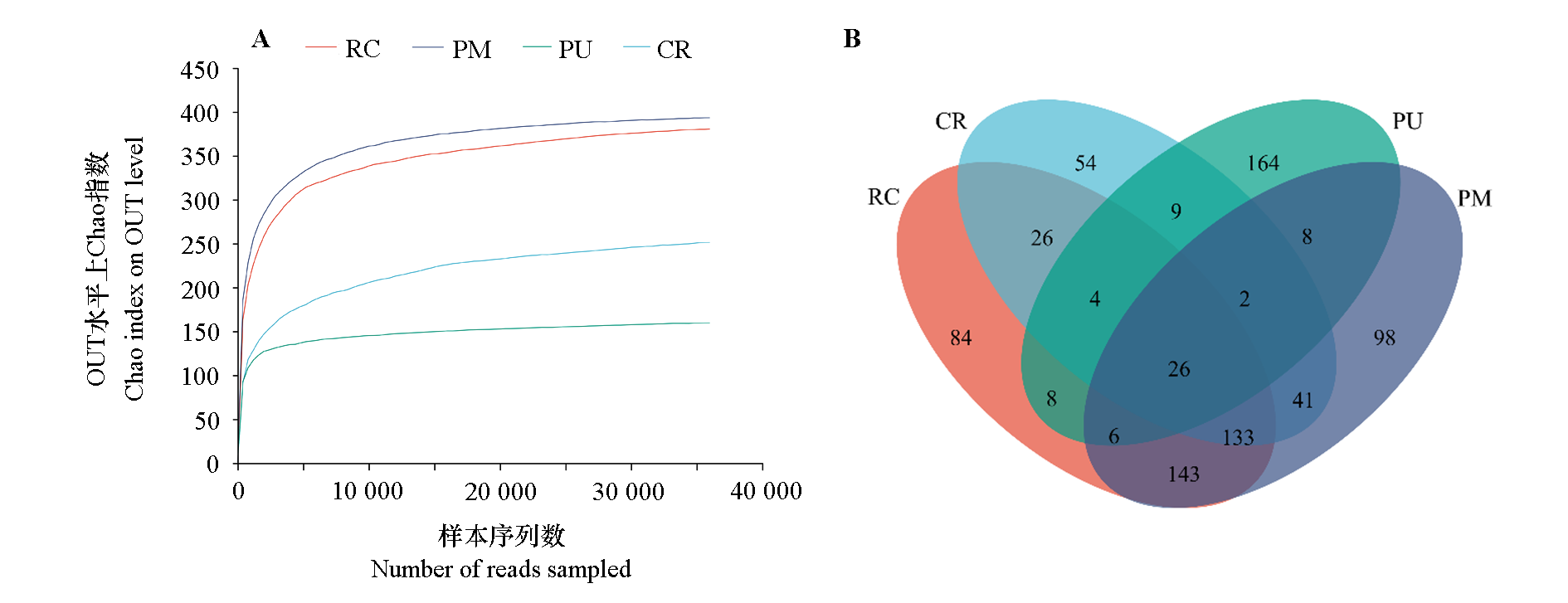 Fig. 1 Dilution curve(A)and Venn diagram(B)of OTU distribution in rhizosphere soil fungi of Rubus corchorifolius under four forest stands in Jinyun Mountain RC:Rubus corchorifolius stand;CR:Citrus reticulata stand;PU:Phyllostachys ubescen stand;PM:Pinus massoniana stand. The same below