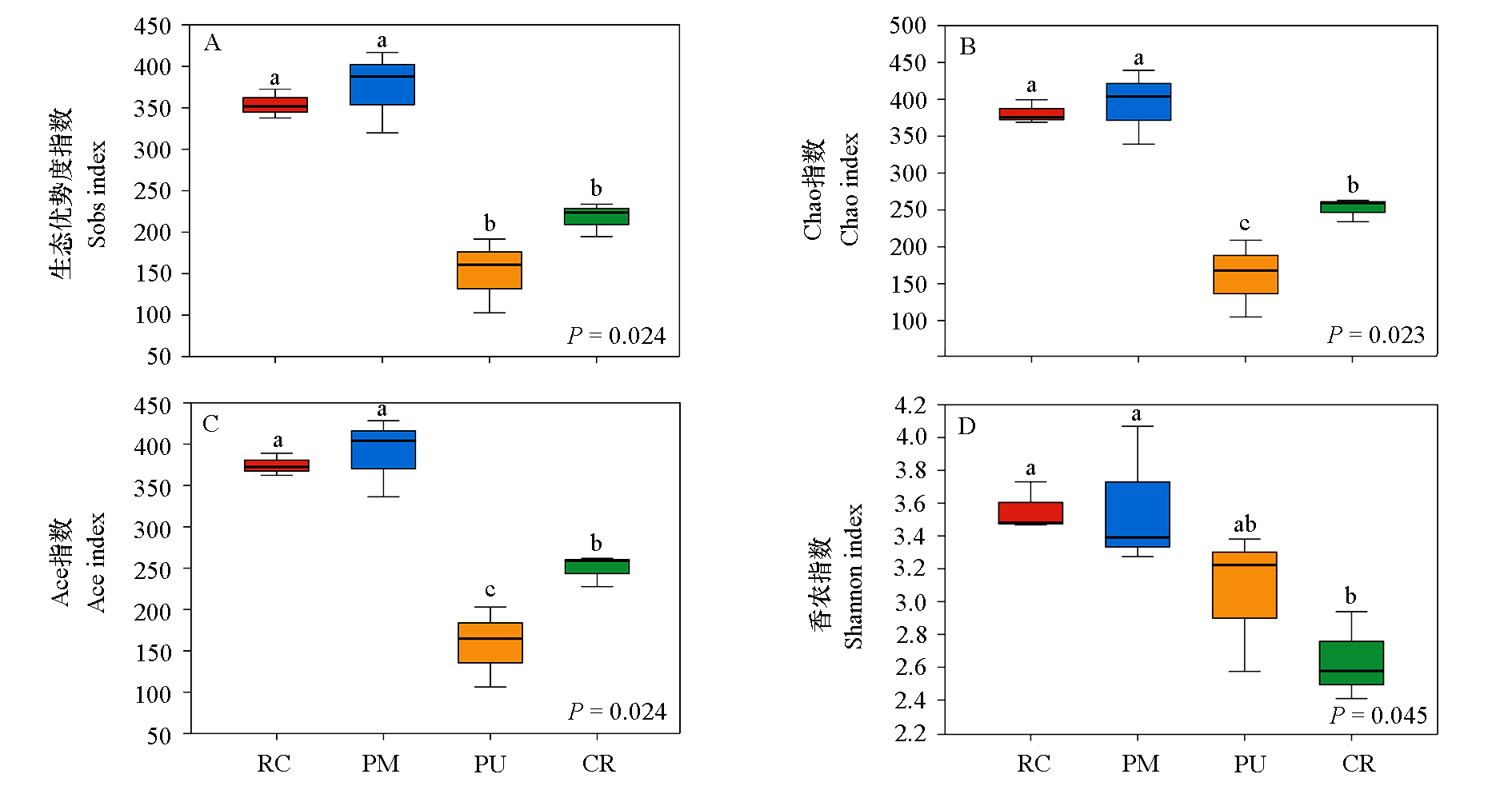Fig. 2 Indexes of Sobs(A),Chao(B),Ace(C)and Shannon(D)of rhizosphere soil fungi of Rubus corchorifolius under four forest stands in Jinyun Mountain Different lowercase letters indicate significant differences among different forest stands at 0.05 level