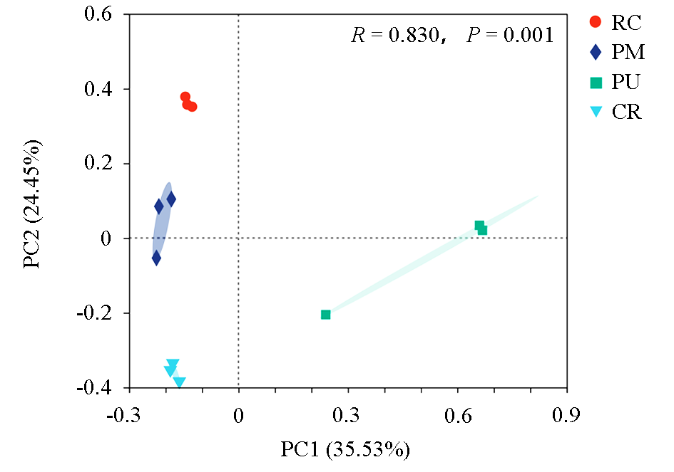 Fig. 3 Principal Co-ordinates Analysis(PCoA)of the rhizosphere soil fungal community of Rubus corchorifolius under four forest stands in Jinyun Mountain