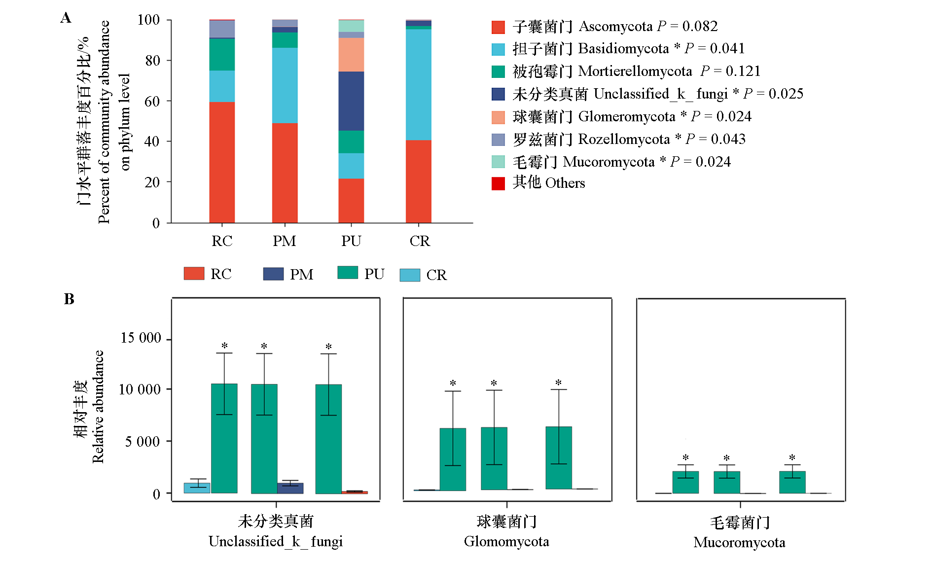 Fig. 4 Classification results(A)and difference comparison(B)of the rhizosphere soil fungal at the phylum level of Rubus corchorifolius under four forest stands in Jinyun Mountain The asterisk * in Fig. A indicates a significant difference among multiple groups(Kruskal-Wallis test),while in Fig. B,it signifies a significant difference between two groups(Wilcoxon test),P < 0.05 for both