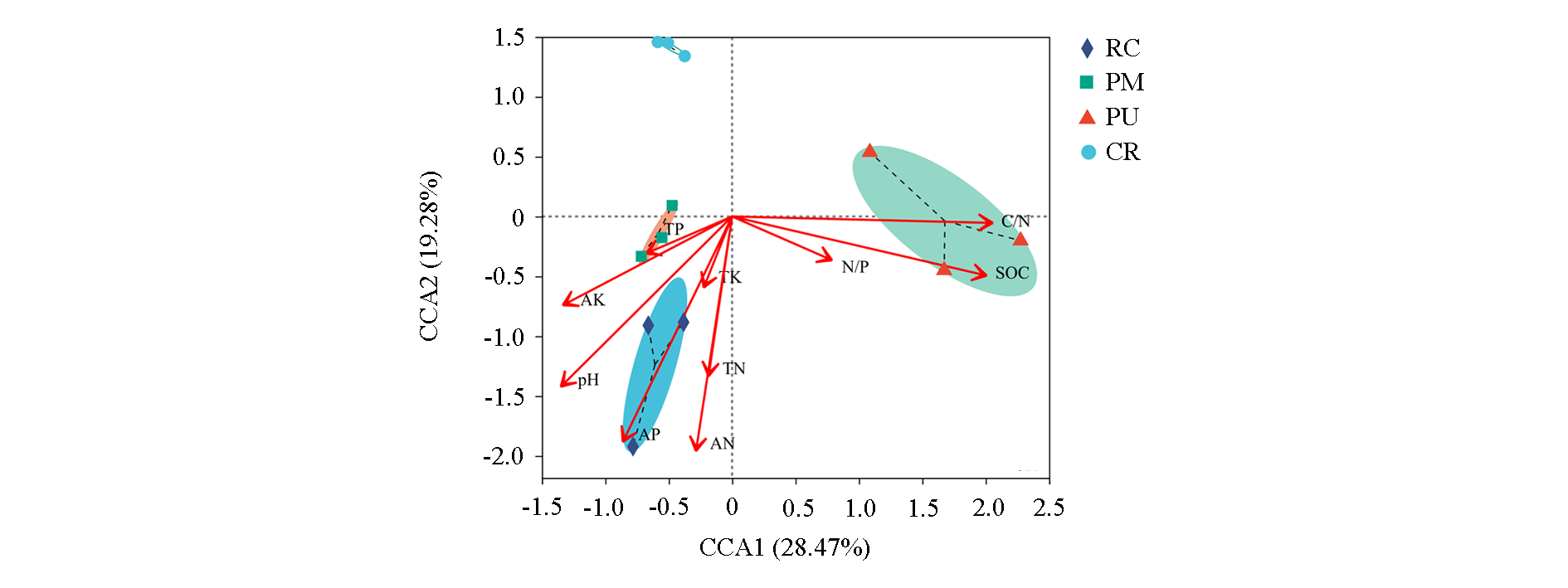 Fig. 7 Canonical Correspondence Analysis(CCA)of the rhizosphere soil fungal community of Rubus corchorifolius with soil nutrients content under four forest stands in Jinyun Mountain Codes for nutrients refer to Table 2,and the same applies hereafter. In the diagram,samples from different environments or conditions are represented by points of varying colors or shapes. Red arrows indicate quantitative environmental variables. By projecting sample points onto the directional arrows of quantitative environmental variables,the distance from the projection point to the origin reflects the relative influence of the environmental variable on community distribution,while the directional alignment between sample points and arrows indicates positive or negative correlations