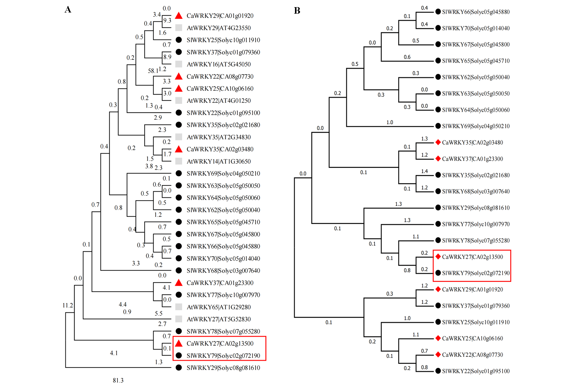 Fig. 1 Phylogenetic analysis of WRKYⅡe subfamily members from Arabidopsis,tomato,and pepper A:Phylogenetic analysis of WRKYⅡe subfamily members in pepper(Ca),tomato(Sl),and Arabidopsis(At);B:Phylogenetic analysis of WRKYⅡe subfamily members in pepper(Ca)and tomato(Sl). The tree was constructed using the maximum likelihood method