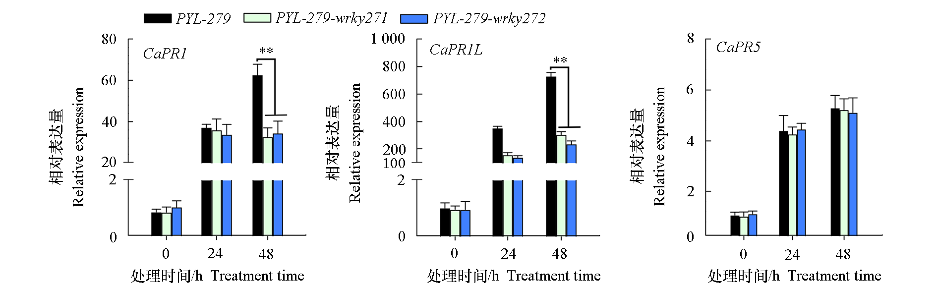 Fig. 4 The expression pattern of the SA signaling pathway-related defence genes CaPR1,CaPR1L,and CaPR5 in CaWRKY27-silenced and control pepper plants ** P < 0.01