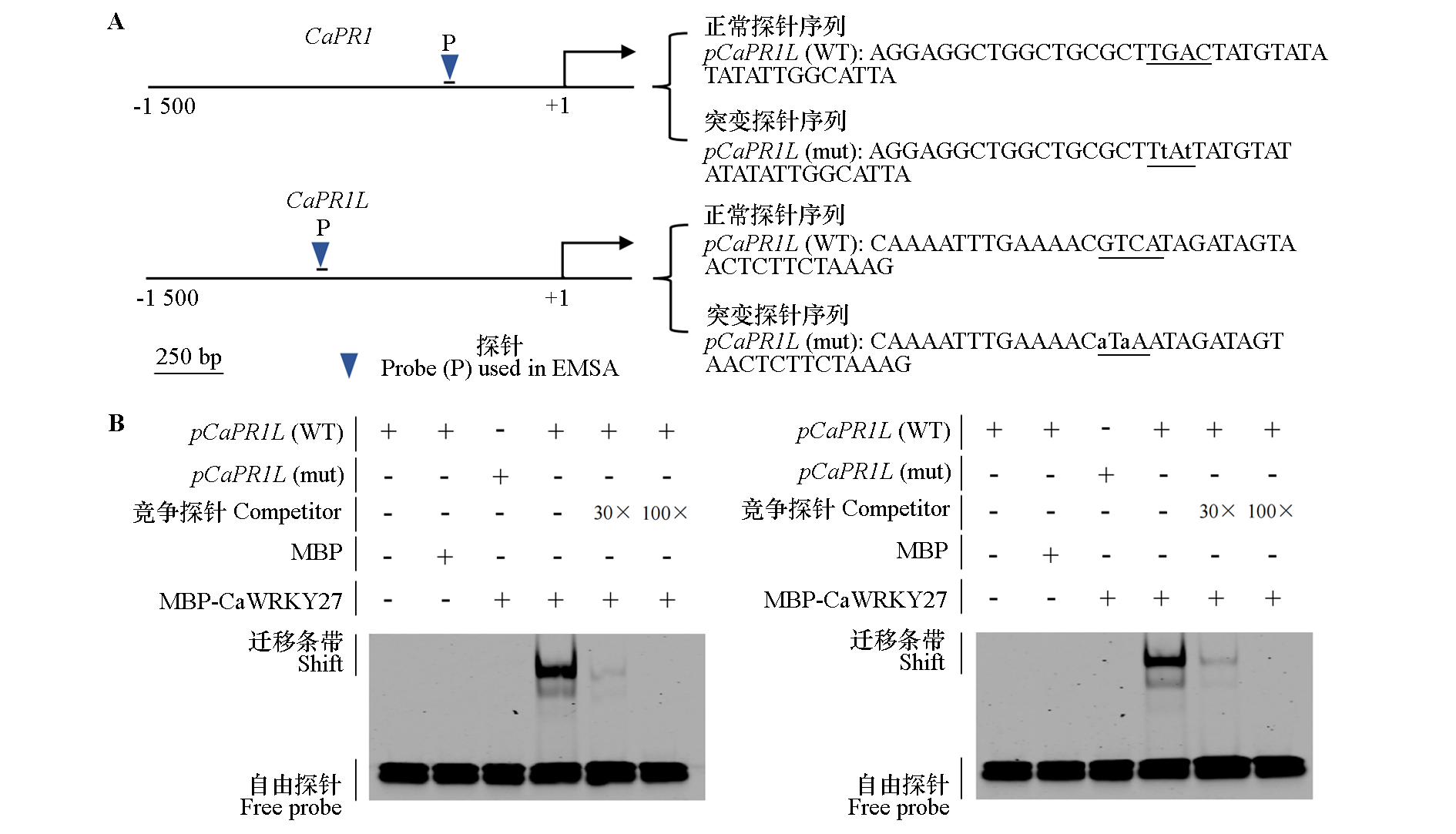 Fig. 5 EMSA for the binding of the pepper CaWRKY27 to the promoters of target genes CaPR1 and CaPR1L A:Schematic diagram of the oligonucleotide probes used in the EMSA experiments;B:EMSA detection of binding of CaWRKY27 to CaPR1 and CaPR1L promoters in vitro. MBP protein and no protein were used as control,respectively,and all experimental groups were added with MBP-CaWRKY27 protein. The underlined nucleotide sequences represents the cis-acting element W-box. The symbols“+”and“-”represent presence or absence of the probe