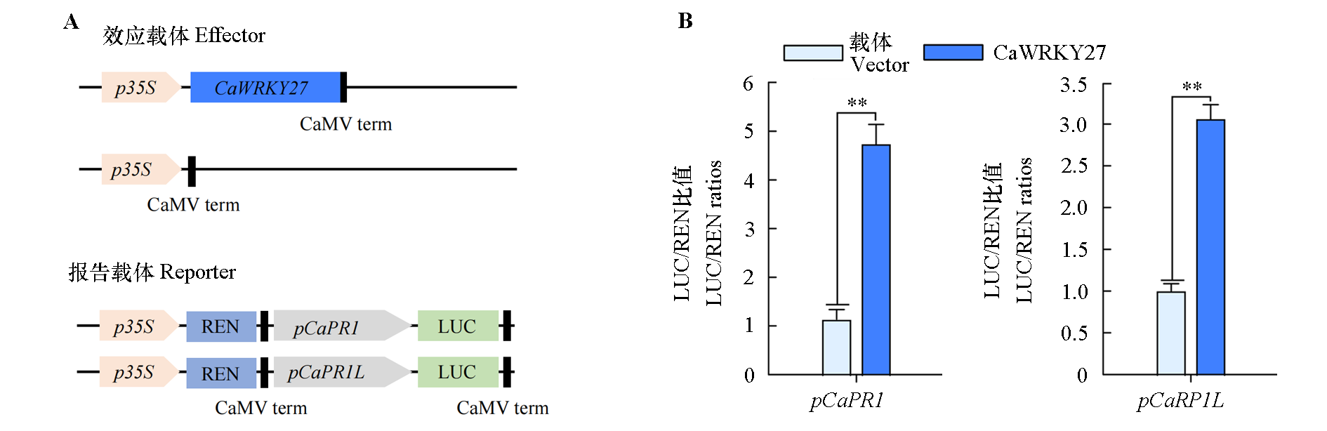 Fig. 6 Dual-luciferase reporter assay to detect for the effect of CaWRKY27 on the promoter activity of target genes CaPR1 and CaPR1L A:Schematic diagram of the reporter vector and effector vector;B:Relative activity of the CaPR1 and CaPR1L promoters. ** P < 0.01