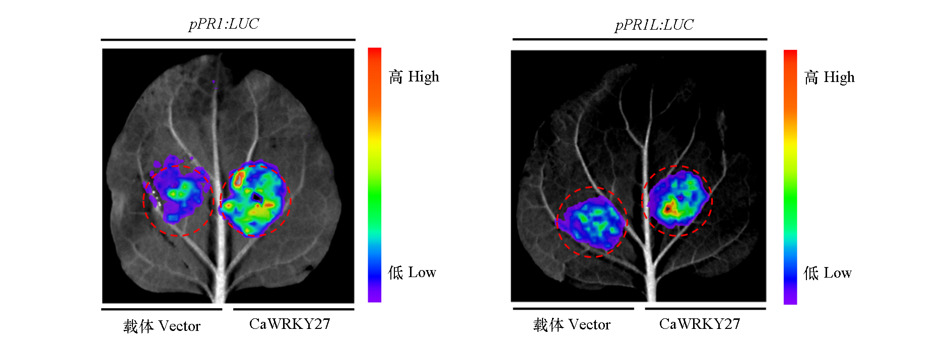 Fig. 7 Transient expression assay to analyze the effect of CaWRKY27 on the expression of LUC reporter gene driven by the promoters of target genes CaPR1 and CaPR1L