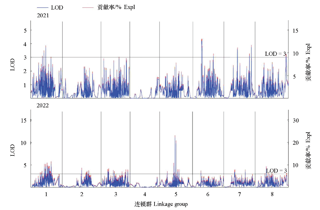 | 年份 Year | 连锁群 Linkage group | 位点 QTL | 置信区间/ cM Confidence interval | 包含标记数 Mark number | LOD | 贡献率/% Phenotypic variation explained(PVE) |