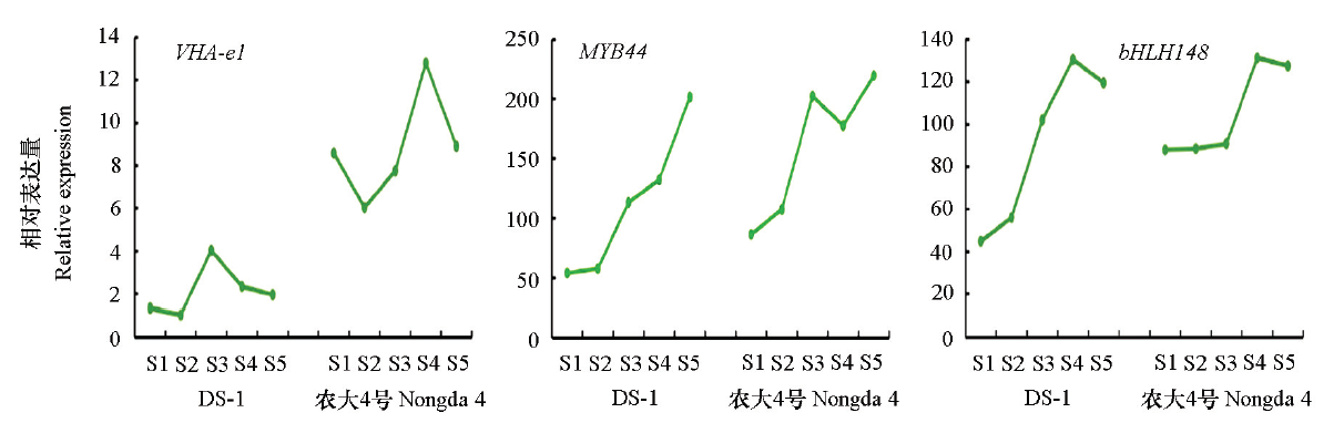 Fig. 5 Dynamic changes of key genes expression during fruit development of different germplasms S1:Young fruit stage;S2:Ard core stage;S3:Turning stage;S4:Coloring stage;S5:Mature stage