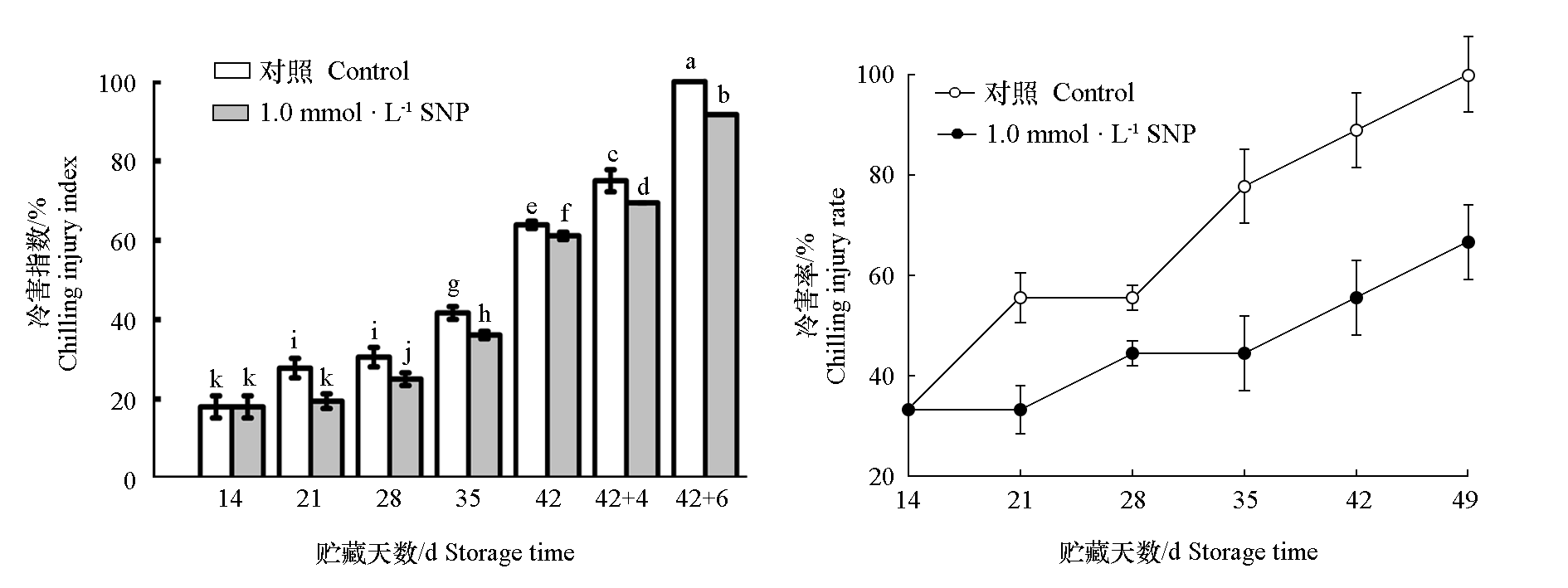 Fig. 2 Effect of SNP treatment on chilling injury index and chilling injury rate of Hami melon The different lowercase letters between groups indicate significant differences(P < 0.05). The same below