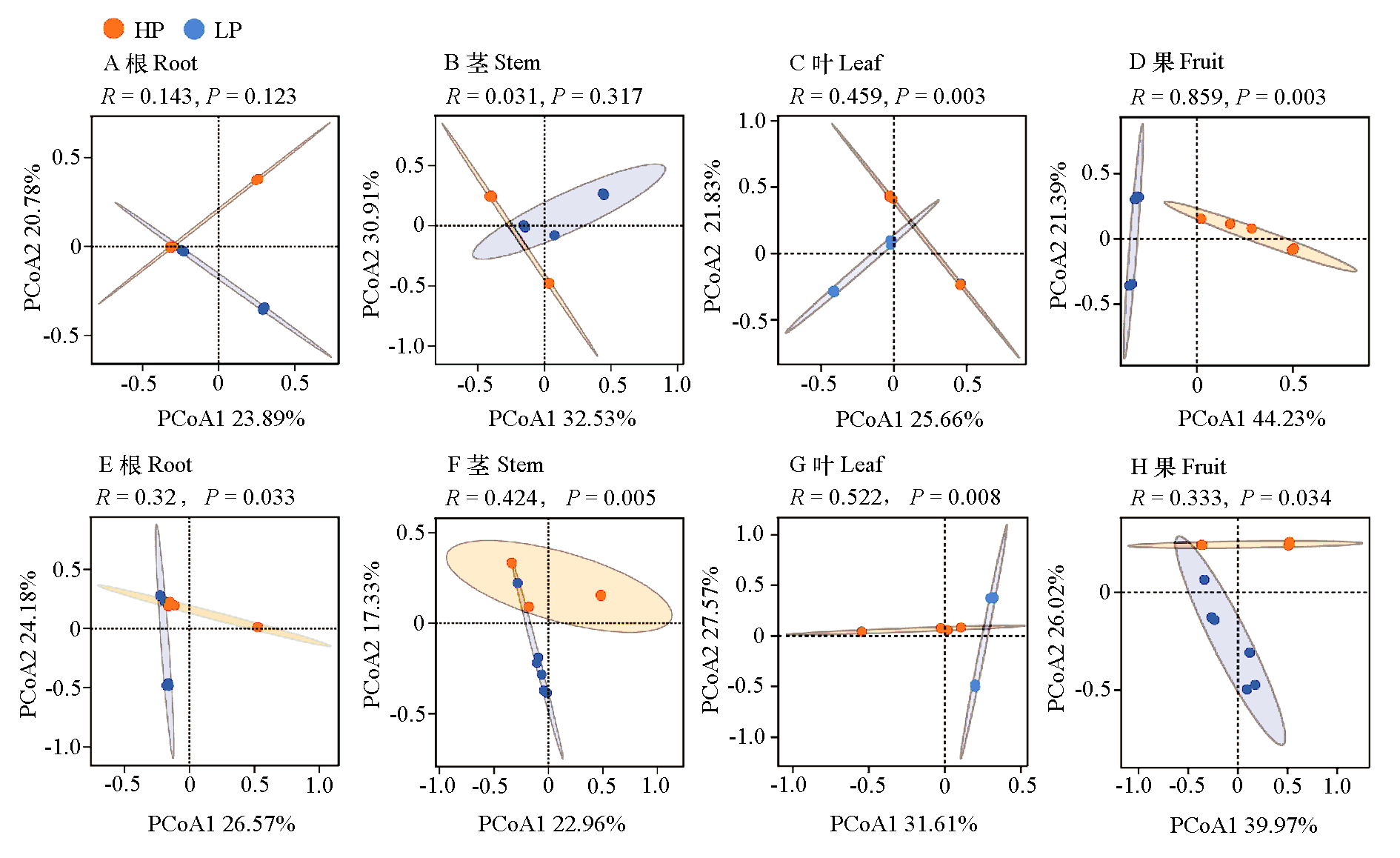 Fig. 2 PCoA analysis of endophytic bacterial(A-D)and fungal(E-H)in high-SSC and low-SSC peppers across different parts HP:High-SSC pepper;LP:Low-SSC pepper. The same below. Permutational multivariate analysis of variance(PERMANOVA)was used to test for significant differences in community structure between groups. a larger R value (P < 0.05)indicates significant inter-group separation of community structures