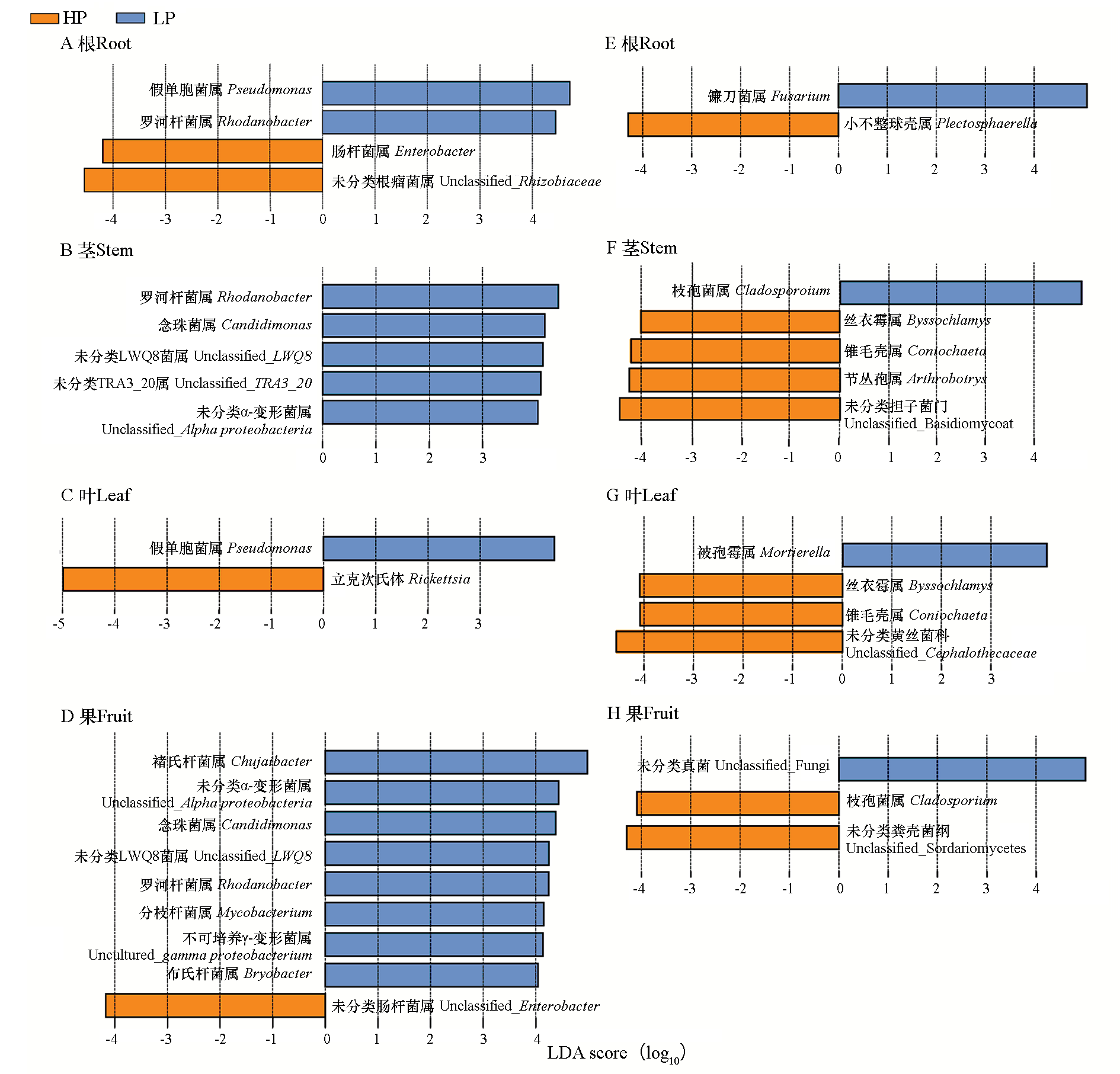 Fig. 4 LEfSe analysis of bacterial(A-D)and fungal(E-H)communities in high-SSC and low-SSC peppers across different parts The horizontal axis indicates log10 transformed LDA score
