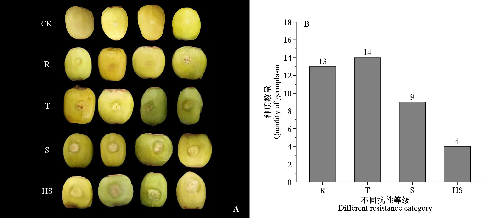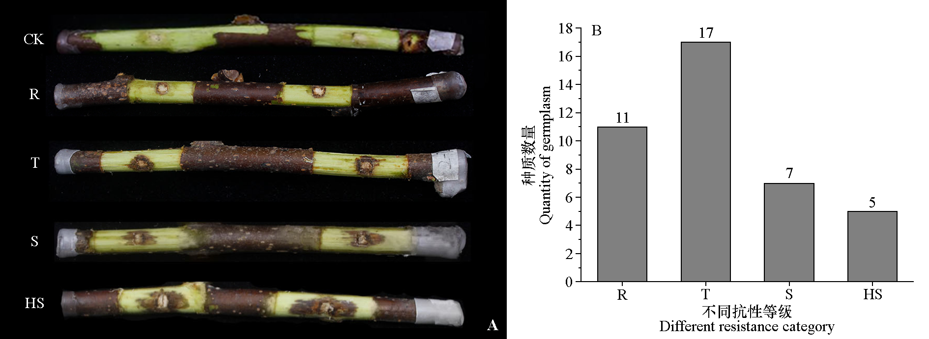 Fig. 1 Lesion corresponding to degrees(A)and the quantity of germplasm(B)for canker disease in‘Jinfeng’kiwifruit branch R:Resistant;T:Tolerant;S:Susceptible;HS:High Susceptible. The same below