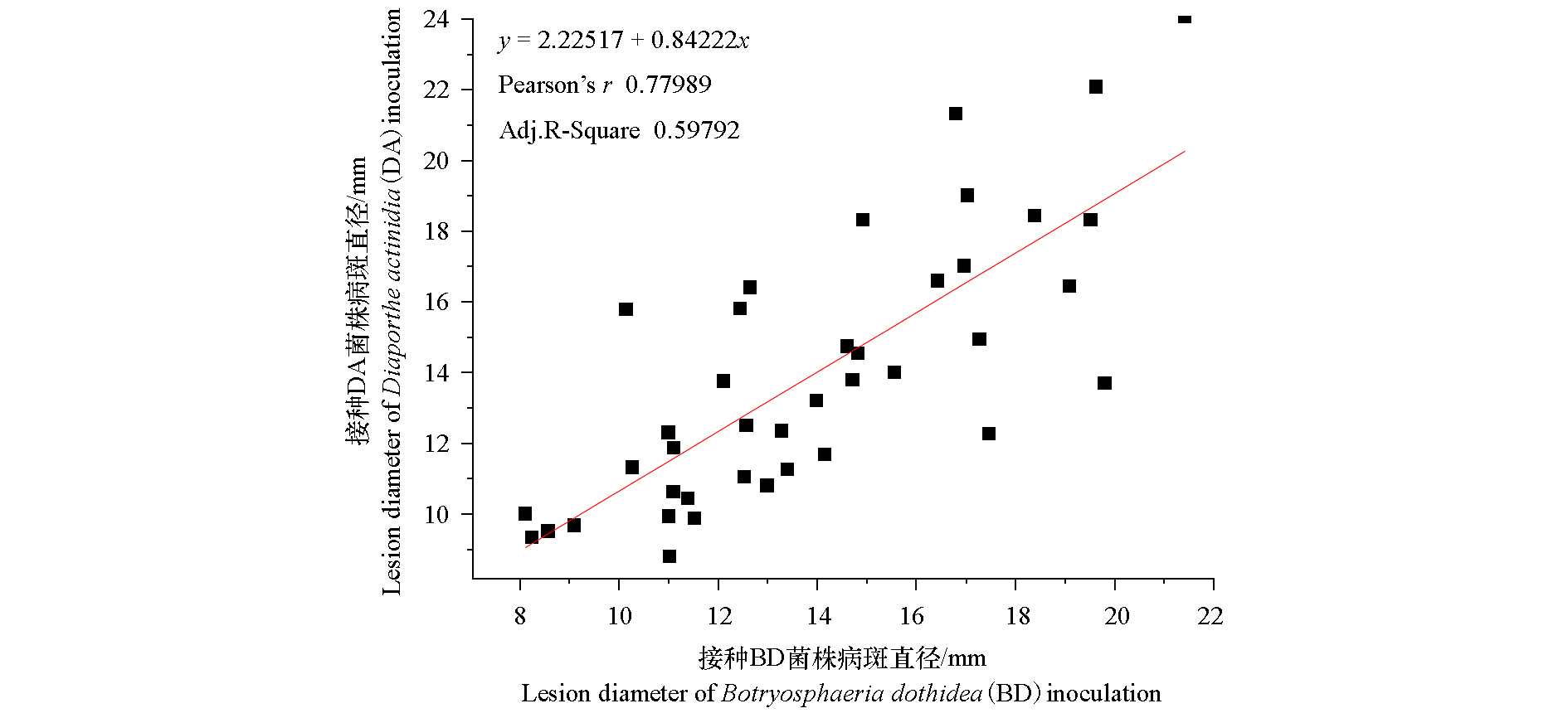 Fig. 3 Correlation analysis between average lesion diameter of Botryosphaeria dothidea(BD)and Diaporthe actinidia(DA)inoculation in‘Jinfeng’kiwifruit fruit