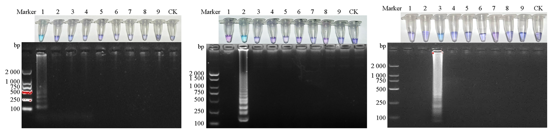 Fig. 1 Primer specificity verification for the three Fusarium species 1:Fusarium oxysporum;2:Fusarium equiseti;3:Fusarium solani;4:Fusarium decemcellulare;5:Fusarium incarnatum;6:Fusarium sporotrichioides;7:Fusarium lateritium;8:Phomopsis sp;9:Stagonosporopsis sp. CK:Negative control,the same below