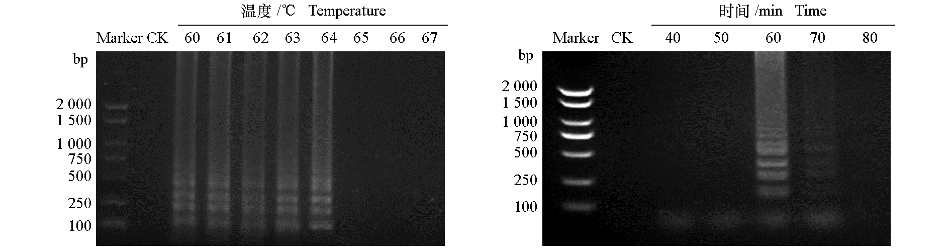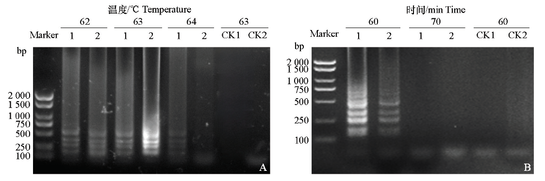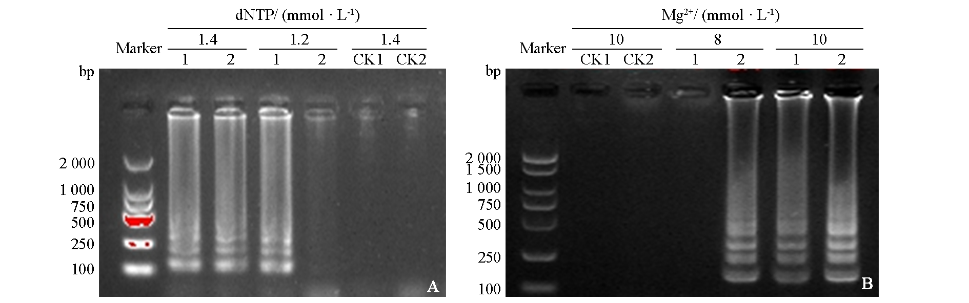 Fig. 5 Validation of the dNTP(A)and Mg2+(B)for the LAMP test 1:Fusarium equiseti;2:Fusarium solani;CK1:Negative control of Fusarium equiseti;CK2:Negative control of Fusarium solani. The same below