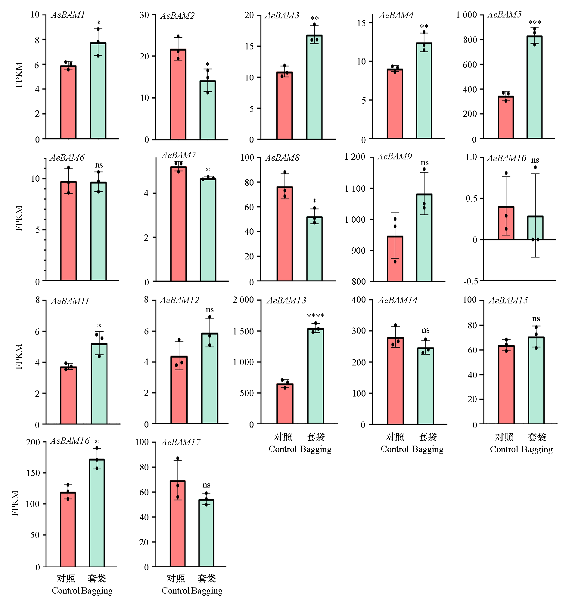 Fig. 6 Expression analysis of AeBAM family genes after fruit bagging * indicates significant differences at P < 0.05,** indicates significant differences at P < 0.01,*** indicates significant differences at P < 0.001,**** indicates significant differences at P < 0.0001,ns indicates no significant difference
