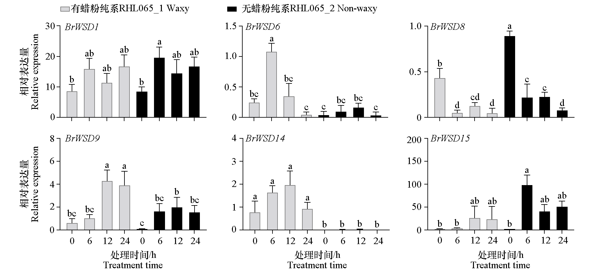 Fig. 9 WSD genes expression analysis in Brassica rapa waxy near isogenic lines under drought stress Different lowercase letters indicate significant differences among different treatments(P < 0.05,n = 3)