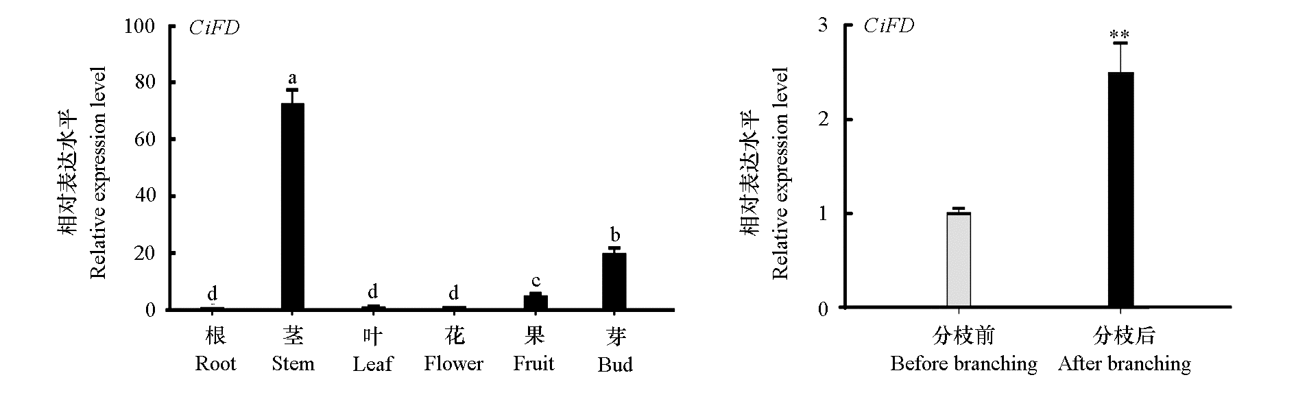 Fig. 3 Spatio-temporal expression analysis of CiFD gene Different lowercase letters indicate significant differences at the P < 0.05 level(Duncan's new multiple range test);** indicates highly significant differences at the P < 0.01 level(Independent samples t-test).